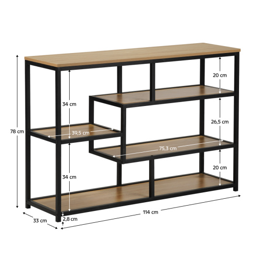Materiál: kov/MDF laminovaná Barva: černá/dub Rozměry (ŠxHxV): 114x33x78 cm Tloušťka MDF: 1,5 cm Výška nožiček: 2,8 cm Nosnost na jednu polici: 5 kg Otevřený úložný prostor Pět odkládacích ploch Kovová konstrukce Doporučujeme připevnit ke zdi Dodáváno v demontu