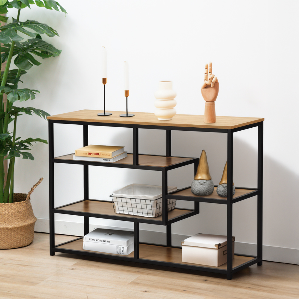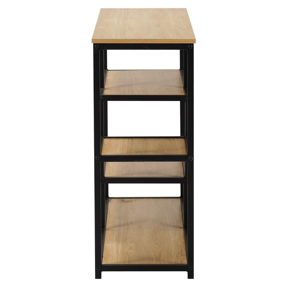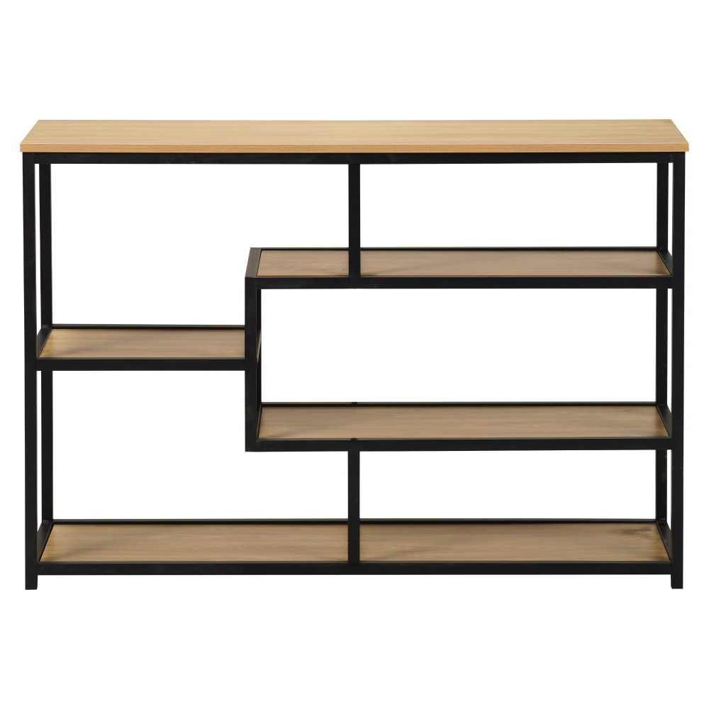 Materiál: kov/MDF laminovaná Barva: černá/dub Rozměry (ŠxHxV): 114x33x78 cm Tloušťka MDF: 1,5 cm Výška nožiček: 2,8 cm Nosnost na jednu polici: 5 kg Otevřený úložný prostor Pět odkládacích ploch Kovová konstrukce Doporučujeme připevnit ke zdi Dodáváno v demontu
