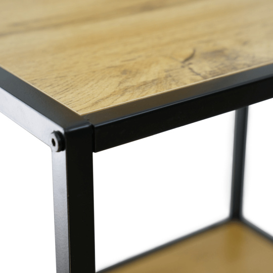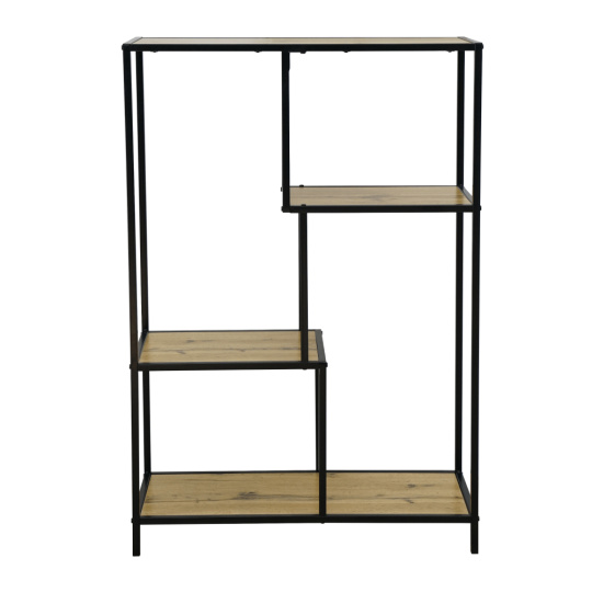 Materiál: kov/MDF laminovaná Barva: černá/dub Rozměry (ŠxHxV): 77x33x114,5 cm Tloušťka MDF: 1,5 cm Výška nožiček: 7,5 cm Nosnost na jednu polici: 5 kg Otevřený úložný prostor Čtyři odkládací plochy Kovová konstrukce Doporučujeme připevnit ke zdi Dodáváno v demontu