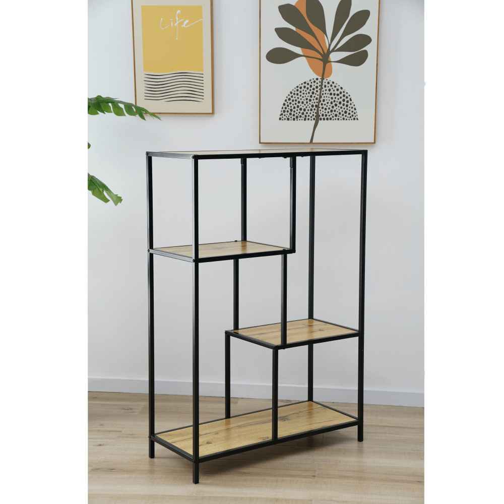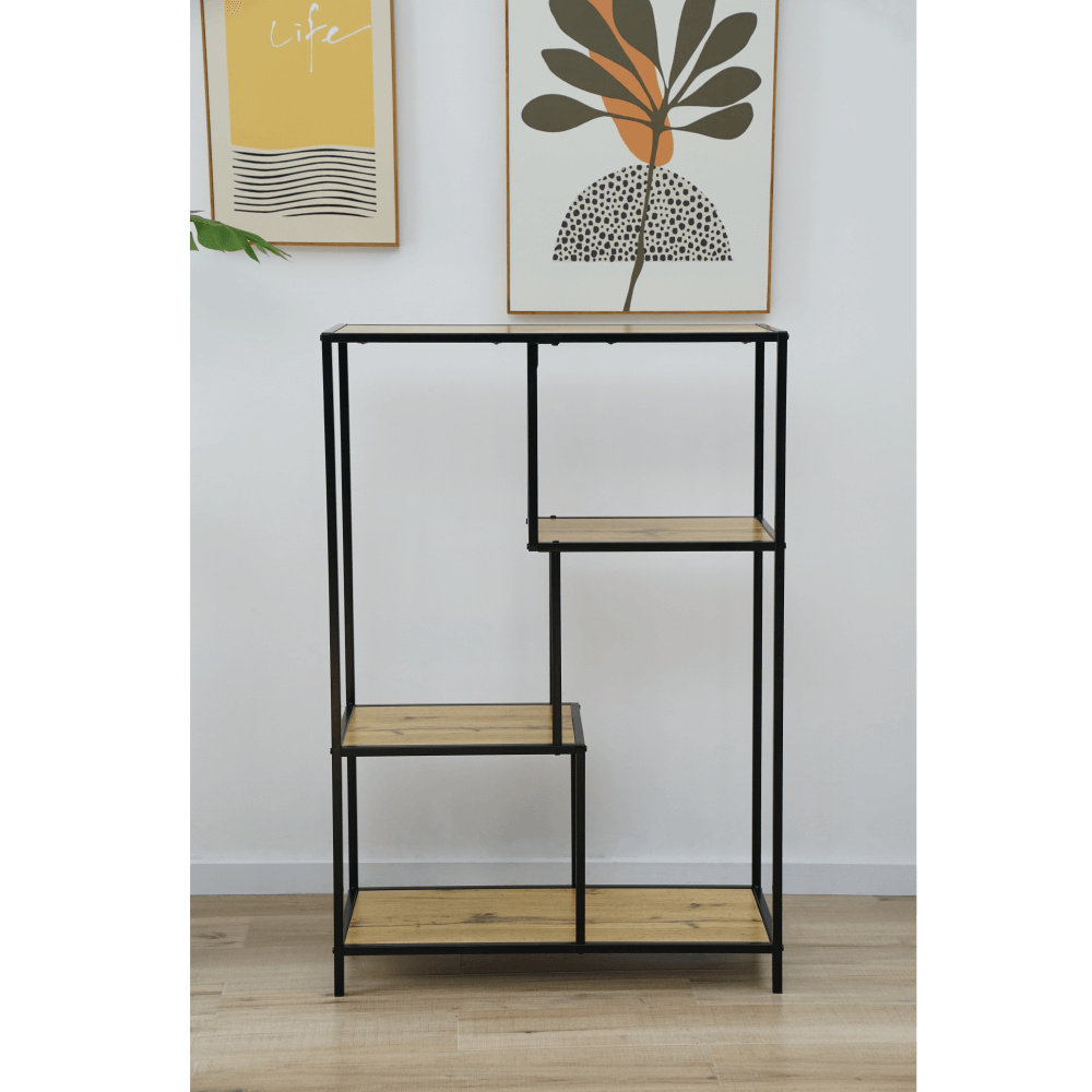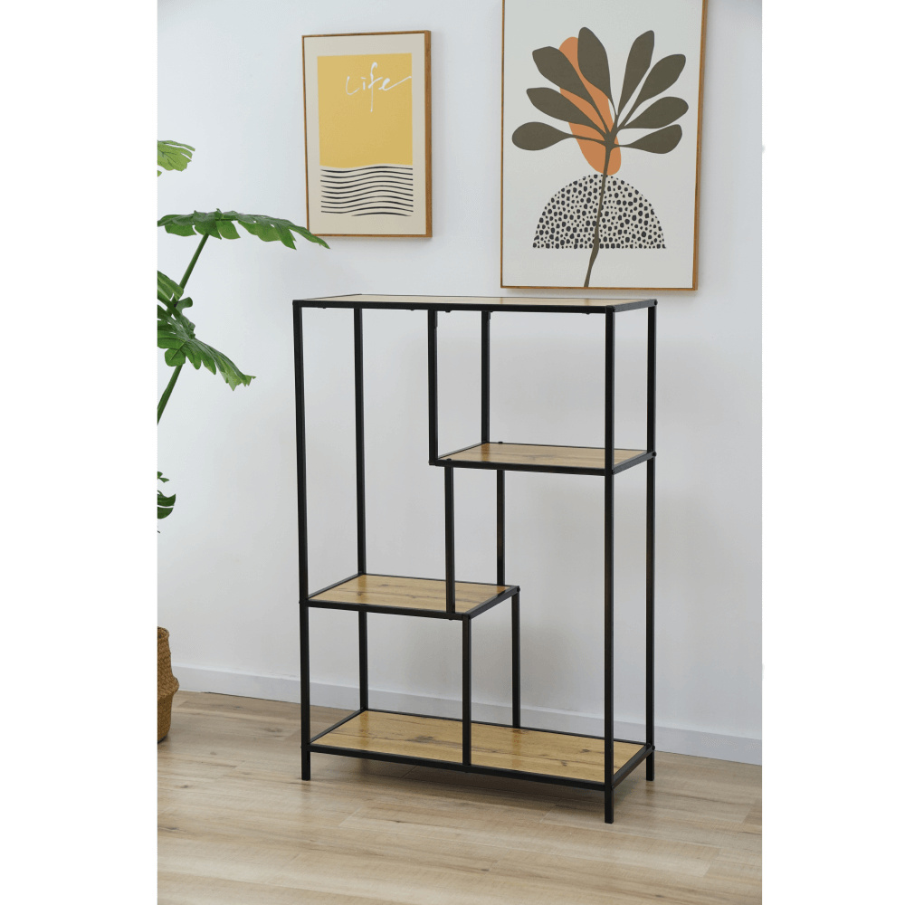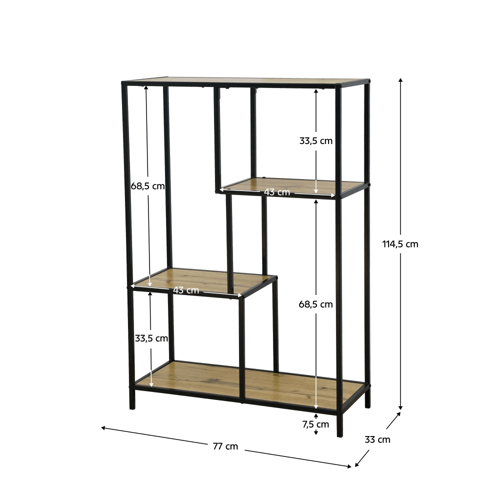 Materiál: kov/MDF laminovaná Barva: černá/dub Rozměry (ŠxHxV): 77x33x114,5 cm Tloušťka MDF: 1,5 cm Výška nožiček: 7,5 cm Nosnost na jednu polici: 5 kg Otevřený úložný prostor Čtyři odkládací plochy Kovová konstrukce Doporučujeme připevnit ke zdi Dodáváno v demontu