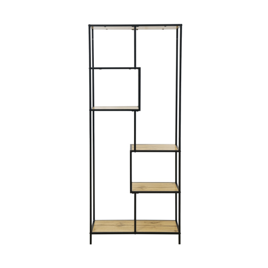 Materiál: kov/MDF laminovaná Barva: černá/dub Rozměry (ŠxHxV): 77x33x185 cm Tloušťka MDF: 1,5 cm Výška nožiček: 8,5 cm Nosnost na jednu polici: 8 kg Otevřený úložný prostor Šest odkládacích ploch Kovová konstrukce Doporučujeme připevnit ke zdi Dodáváno v demontu