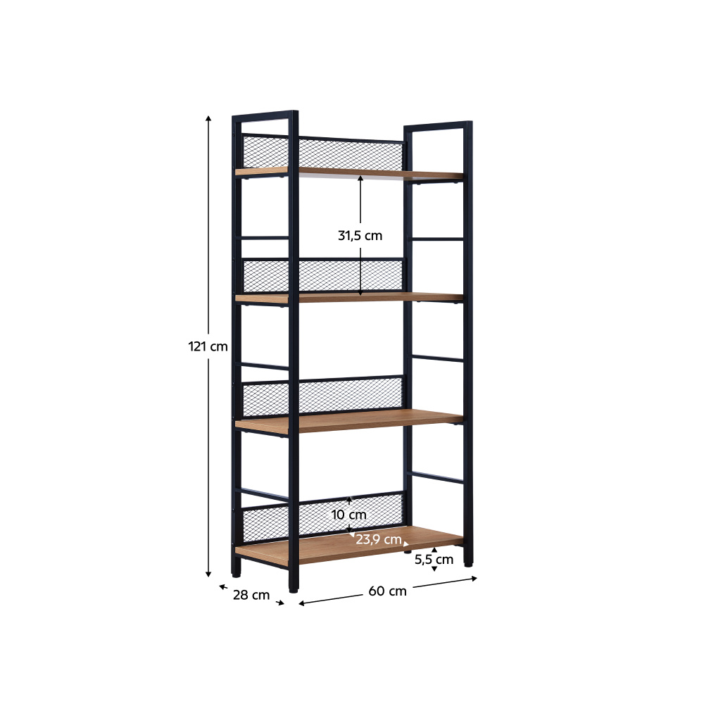 Materiál: kov/DTD laminovaná Barva: černá/dub Rozměry (ŠxHxV): 60x28x121 cm Nosnost na jednu polici: 10 kg Tloušťka materiálu: 1,5 cm Rozměry police (ŠxH): 60x23,9 cm Výška mezi policemi: 31,5 cm Výška nožiček: 5,5 cm Otevřený úložný prostor Čtyři odkládací plochy Kovová konstrukce Víceúčelový Moderní Praktický Kombinovatelný s KELER TYP 1-3 Doporučujeme připevnit ke zdi Dodáváno v demontu