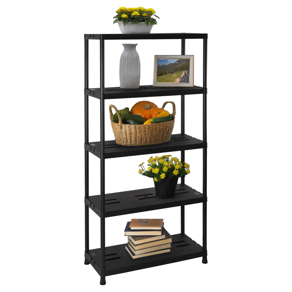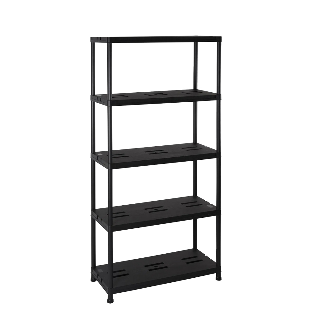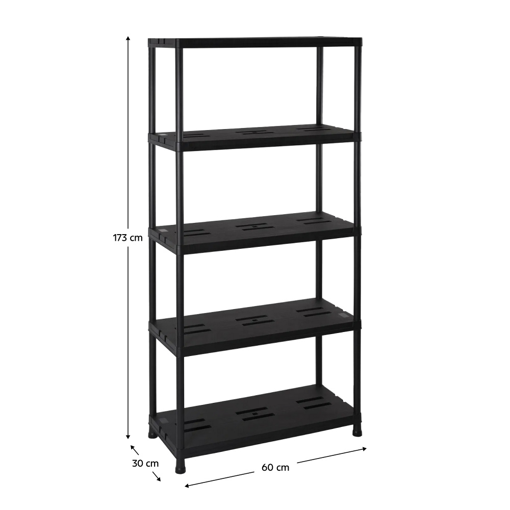 Materiál: plast Barva: černá Rozměry (ŠxHxV): 60x30x173 cm Nosnost na polici: 20 kg Nosnost: Max. 100 kg Policový Víceúčelový Praktický 5 odkládacích ploch Otevřený úložný prostor Doporučujeme rovnoměrné zatížení polic Jednoduchá, rychlá montáž Jednoduchá údržba Vhodný do dílny, sklepa, kuchyně, garáže, pracovny Moderní Doporučujeme připevnit ke zdi Dodáváno v demontu
