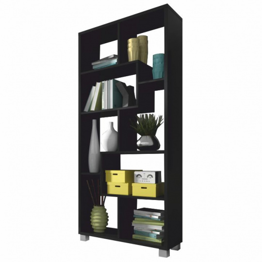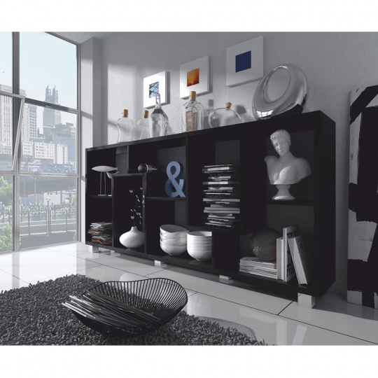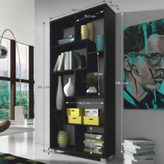 Víceúčelový regál ADEN v černém barevném provedení. Materiál laminovaná DTD. Rozměry vertikální (ŠxHxV): 68,5x25x161,3 cm Rozměry horizontální (ŠxHxV): 156,3x25x73,4 cm Tloušťka materiálu polic: 16 mm Tloušťka materiálu korpus: 22 mm Dodávané v demontu