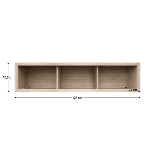 Visací regál 130, NORTY TYP 17 Materiál: DTD laminovaná Provedení: dub sonoma Rozměry (ŠxHxV): 127x28x30,5 cm Tloušťka materiálu: 32 mm Tloušťka materiálu zbývající části: 16 mm Nosnost: 5 kg Dodávané v demontu.