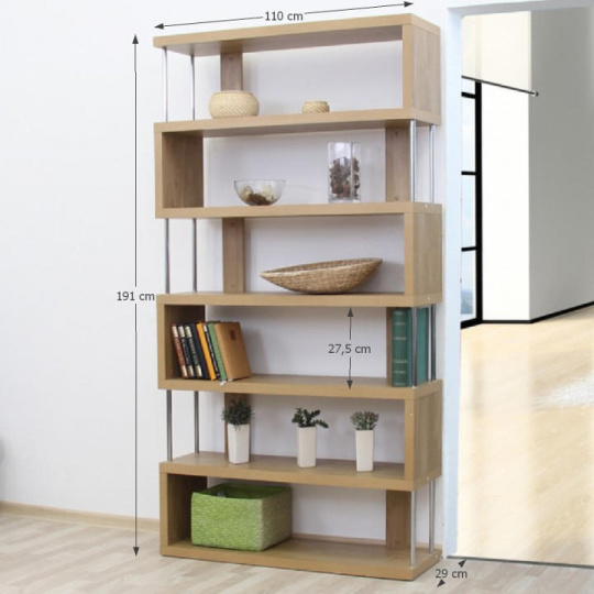 Víceúčelový regál ALIS Materiál: laminovaná DTD / chrom Barva: dub Rozměry (ŠxHxV): 110x29x191 cm Tloušťka materiálu: 36 mm Nosnost na polici: 10 kg Hrany ošetřené páskou z přední i zadní strany Dodávané v demontu