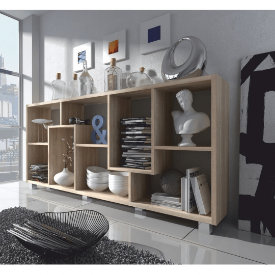 Víceúčelový regál ADEN v barevném provedení dub sonoma. Materiál laminovaná DTD. Rozměry vertikální (ŠxHxV): 68,5x25x161,3 cm Rozměry horizontální (ŠxHxV): 156,3x25x73,4 cm Tloušťka materiálu polic: 16 mm Tloušťka materiálu korpus: 22 mm Dodávané v demontu