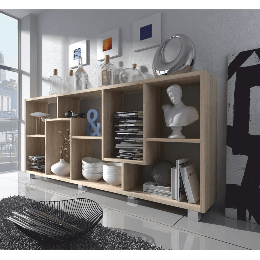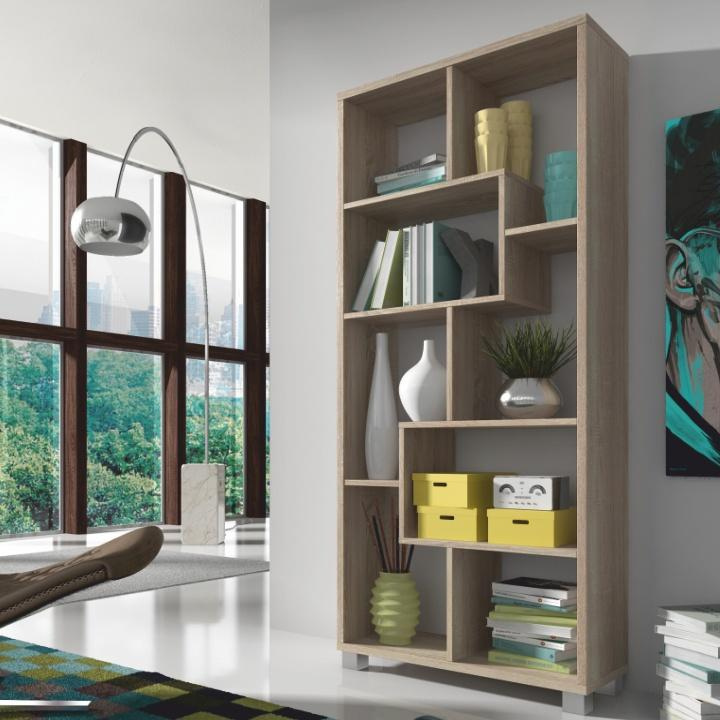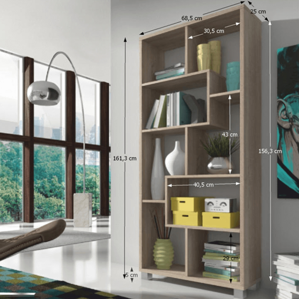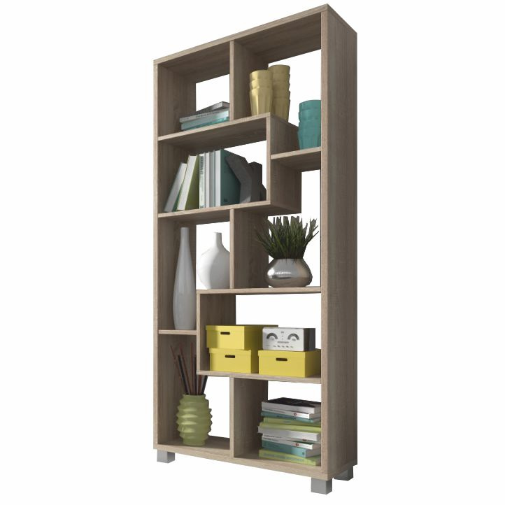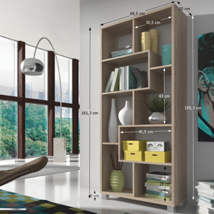 Víceúčelový regál ADEN v barevném provedení dub sonoma. Materiál laminovaná DTD. Rozměry vertikální (ŠxHxV): 68,5x25x161,3 cm Rozměry horizontální (ŠxHxV): 156,3x25x73,4 cm Tloušťka materiálu polic: 16 mm Tloušťka materiálu korpus: 22 mm Dodávané v demontu