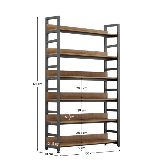 Materiál: laminovaná MDF/kov Barva: dub tmavý/černá Rozměry (ŠxHxV): 80x30x175,5 cm Tloušťka MDF: 1,2 cm Výška nožiček: 7 cm Policový Nosnost police: 5 kg Otevřený úložný prostor Šest odkládacích ploch Víceúčelový Moderní Praktický Doporučujeme připevnit ke zdi Dodáván v demontu