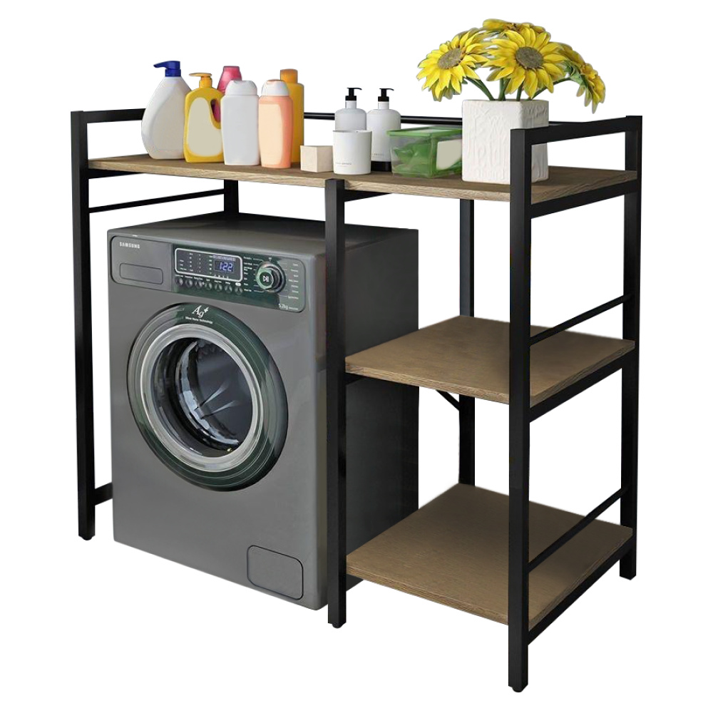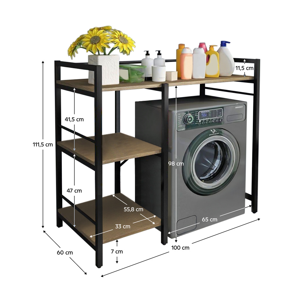 Materiál: laminovaná MDF/kov Barva: dub/černá Rozměry (ŠxHxV): 100x60x111,5 cm Prostor na pračku: 65x98 cm Tloušťka materiálu: 1,2 cm Hmotnost: 12,2 kg Výška nožičky: 7 cm Otevřené police Nosnost na polici: 5 kg Univerzální Praktické vytvoření úložného prostoru Vhodný na pračku Přináší organizaci a uspořádání do koupelny Dodáváno v demontu