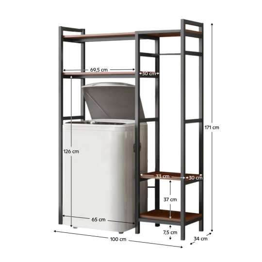 Materiál: laminovaná MDF/kov Barva: dub tmavý/černá Rozměry (ŠxHxV): 100x34x171 cm Prostor na pračku: 65x126 cm Tloušťka materiálu: 1,2 cm Hmotnost: 14,5 kg Otevřené police Nosnost na polici: 5 kg Šířka horní police: 100 cm Hloubka police: 30 cm Výška nožiček: 7,5 cm Praktické vytvoření úložného prostoru Vhodný na pračku Přináší organizaci a uspořádání do koupelny a prádelny S kovovou tyčí pro zavěšení textilií Vhodný pro odkládání toaletních potřeb, osušek, úložných košíků Dodáváno v demontu