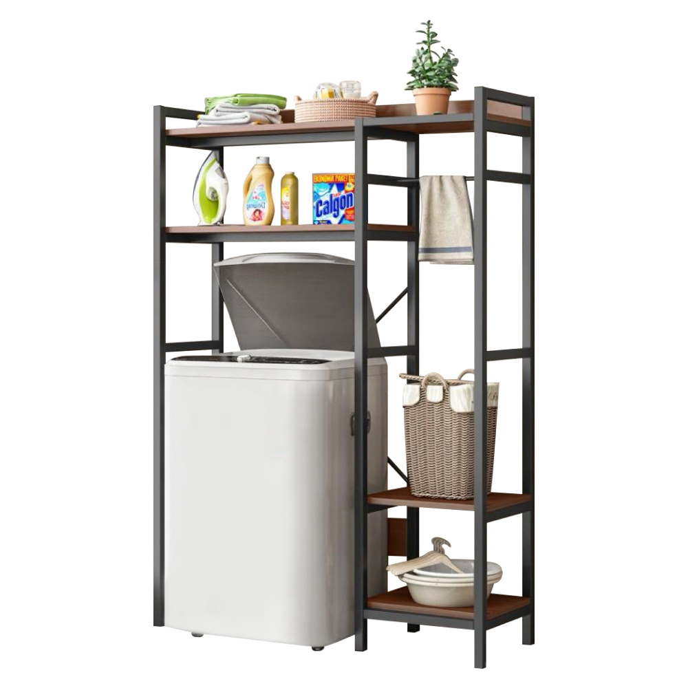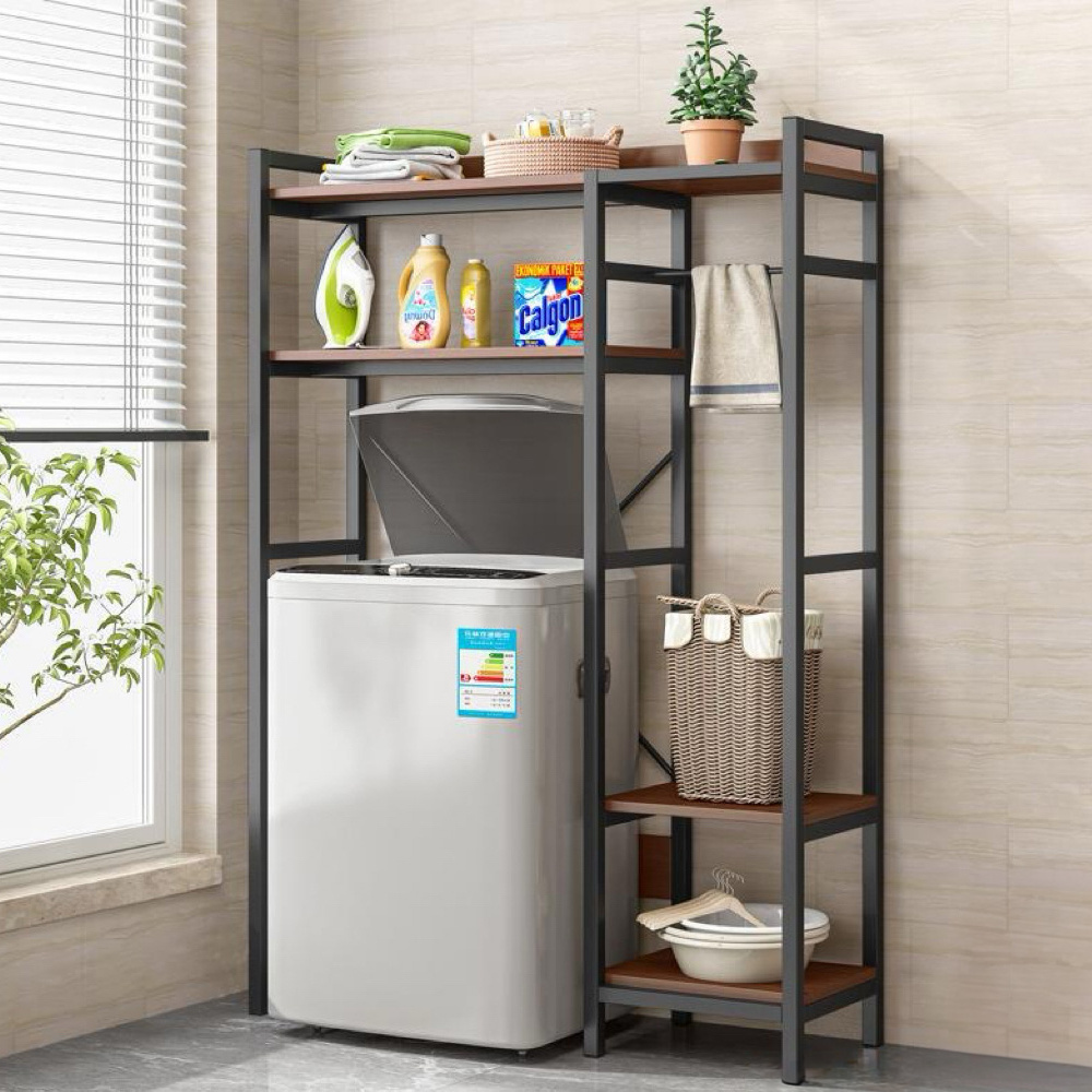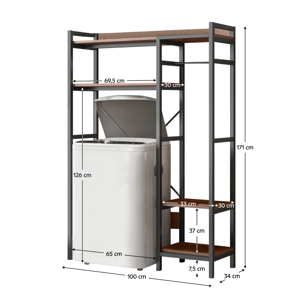 Materiál: laminovaná MDF/kov Barva: dub tmavý/černá Rozměry (ŠxHxV): 100x34x171 cm Prostor na pračku: 65x126 cm Tloušťka materiálu: 1,2 cm Hmotnost: 14,5 kg Otevřené police Nosnost na polici: 5 kg Šířka horní police: 100 cm Hloubka police: 30 cm Výška nožiček: 7,5 cm Praktické vytvoření úložného prostoru Vhodný na pračku Přináší organizaci a uspořádání do koupelny a prádelny S kovovou tyčí pro zavěšení textilií Vhodný pro odkládání toaletních potřeb, osušek, úložných košíků Dodáváno v demontu