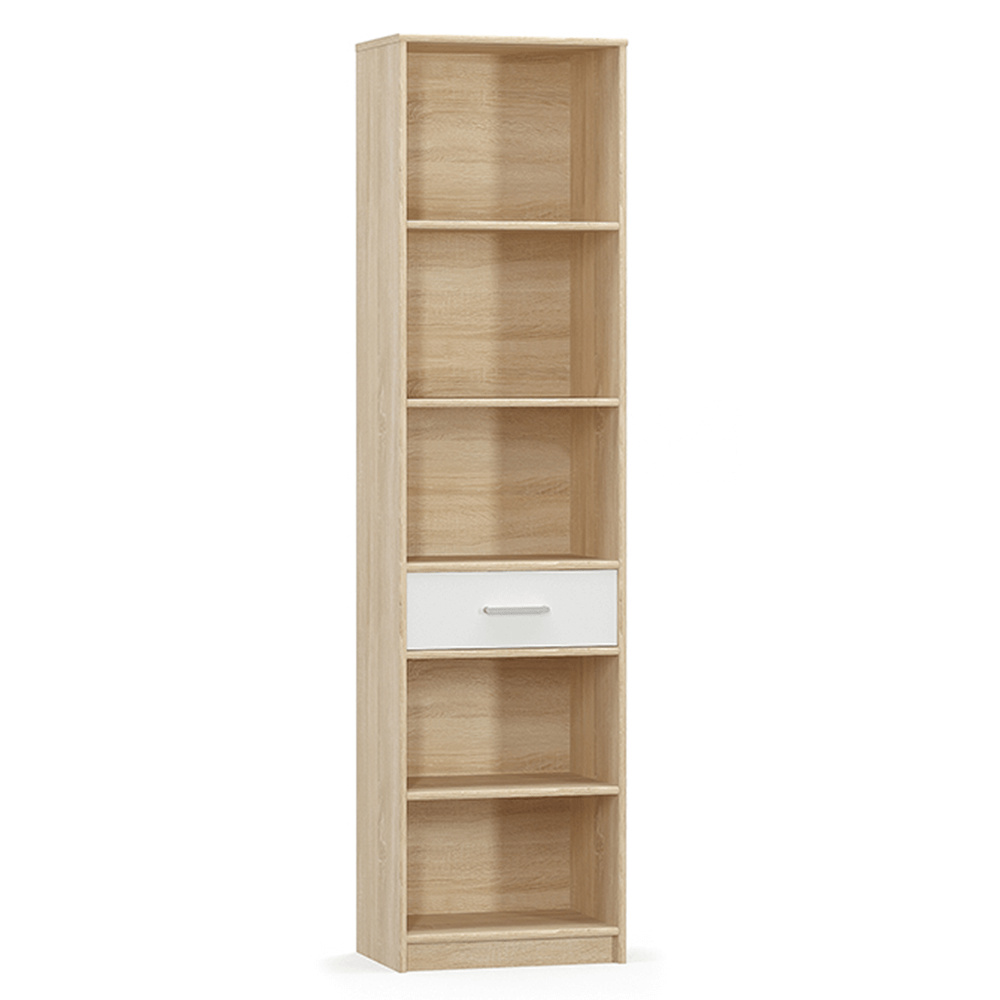 Otevřený regál 1S TEYO Materiál: DTD laminovaná Barva: bílá / dub sonoma Rozměry (ŠxHxV): 50,2x34,3x195,5 cm Tloušťka materiálu: 16 mm Dodávané v demontu.