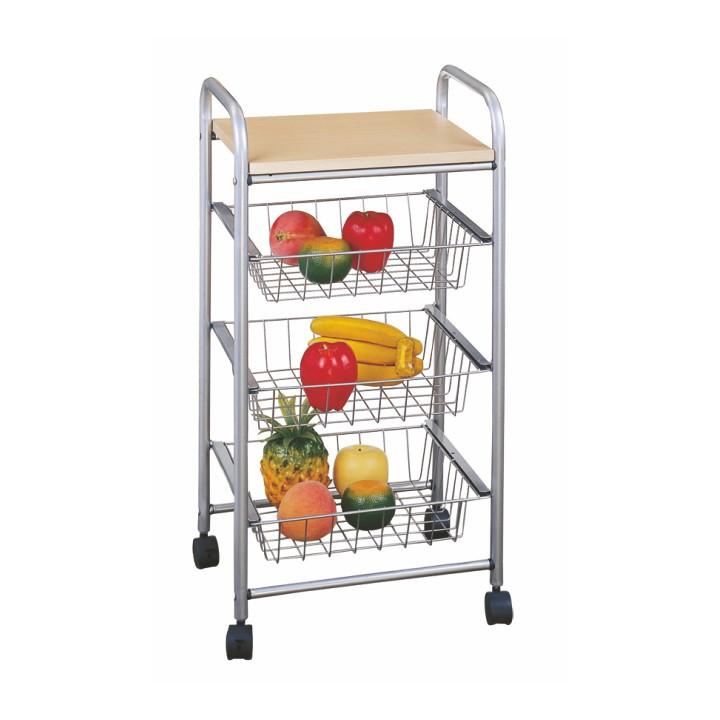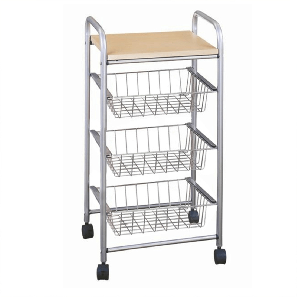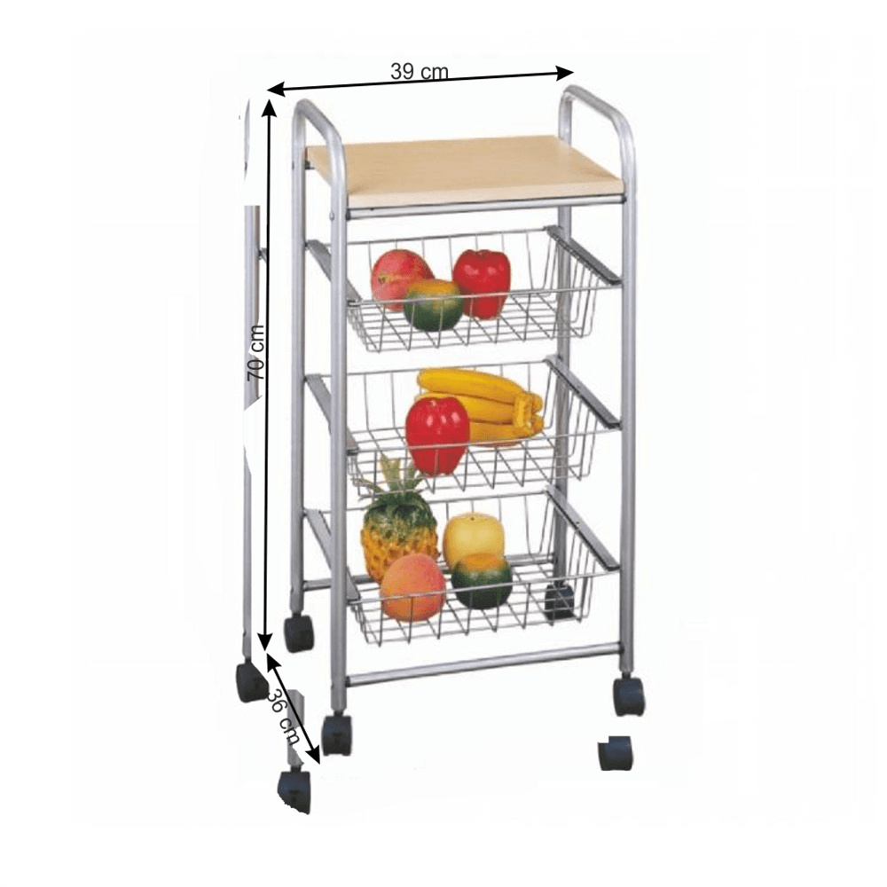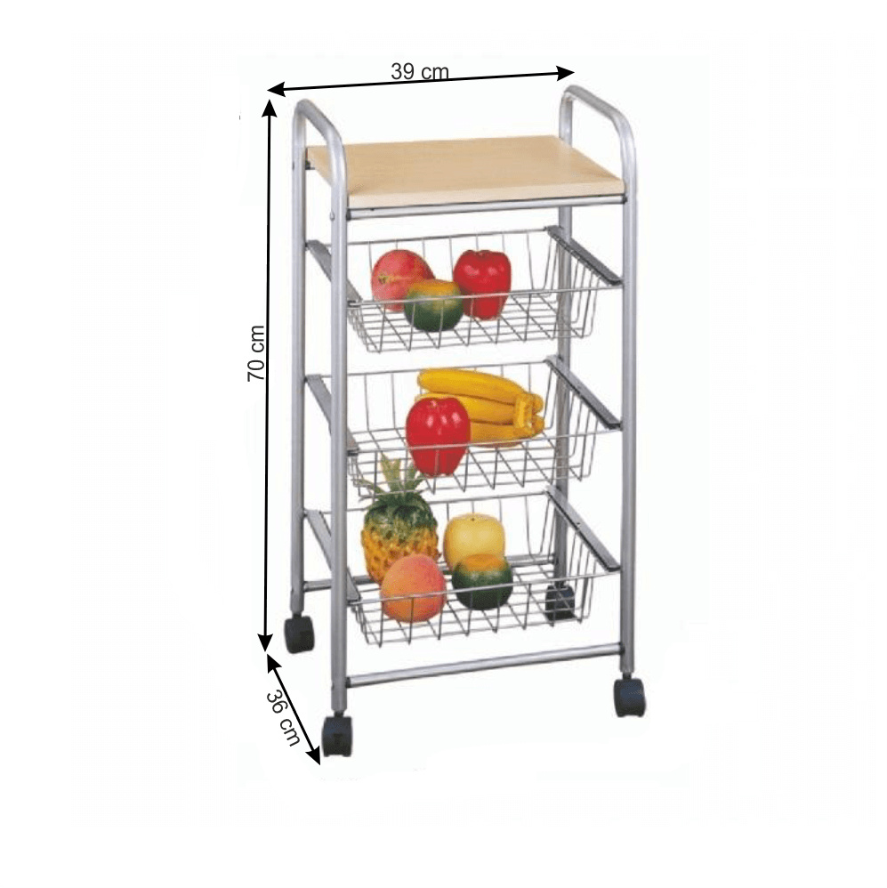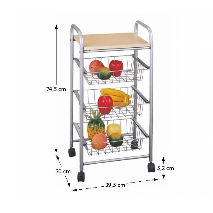 Rozměry (ŠxHxV): 39x36x70 cm Tloušťka materiálu: 15 mm Materiál: MDF buk/ kov Pojízdný regál 3 drátěné košíky Dřevěná polička 4 otočná kolečka Dodáváno v demontu