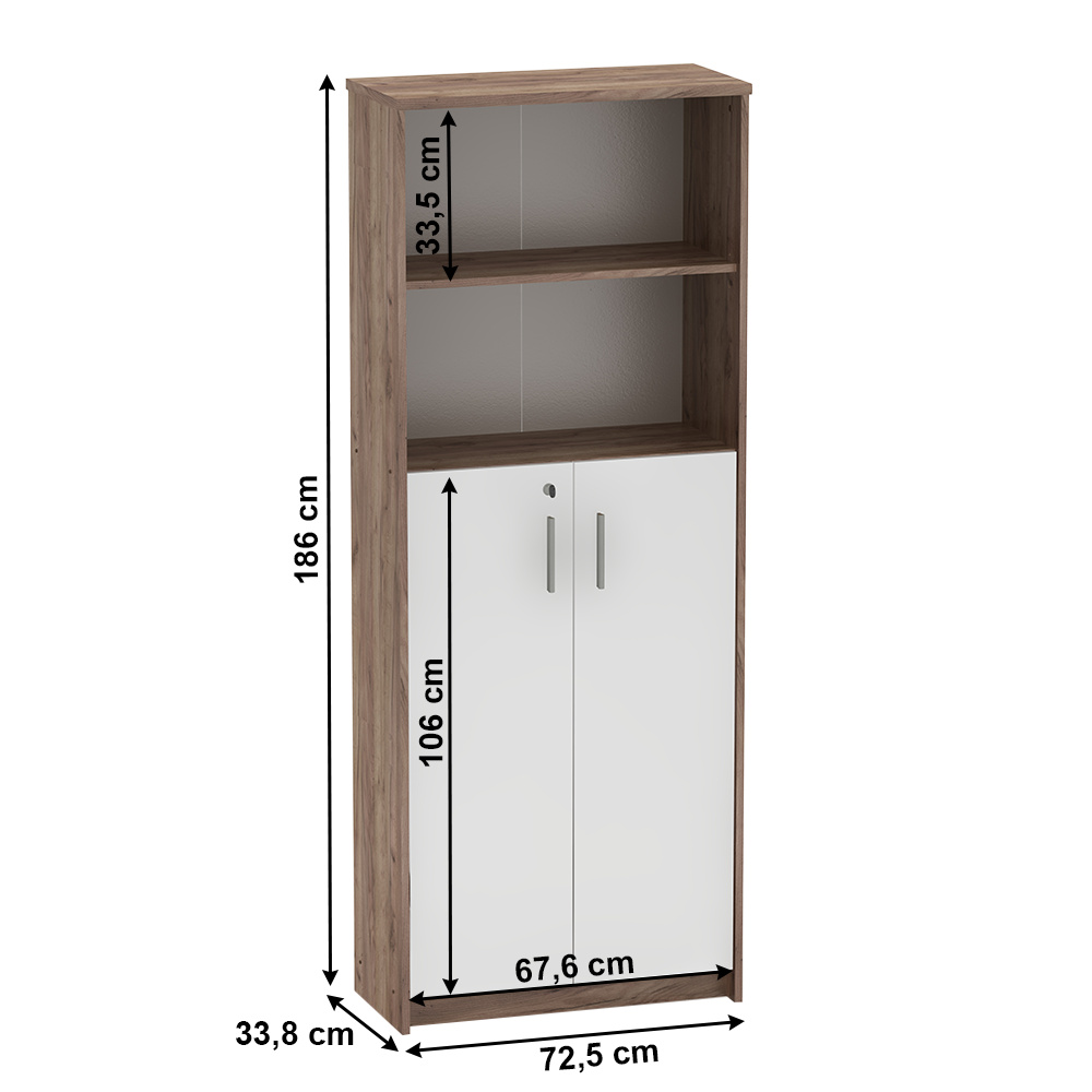 Kancelářský regál se skříňkou na zámek a otevřeným úložným prostorem JOHAN 2 NEW 10 Barevné provedení: kraft dunkel/bílá Materiál: DTD lamiovaná Rozměry (ŠxHxV): 72,5x33,8x186 cm Skříňka s dvířky na zámek Zámek je na dveřích Uvnitř skříňky dvě police Rozměry skříňky (ŠxHxV): 67,6x33,8x106 cm Otevřený úložný prostor jedna police Tloušťka vnitřních polic: 1,6 cm Nosnost polic: max 5 kg Tloušťka materiálu: 16/22 mm ABS hrany slovenský výrobek Dodávané v demontu