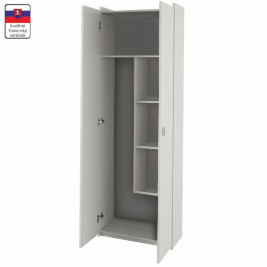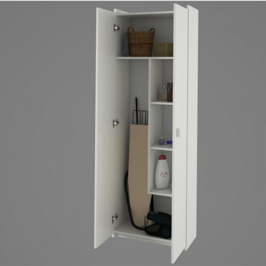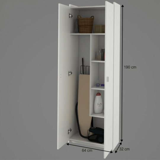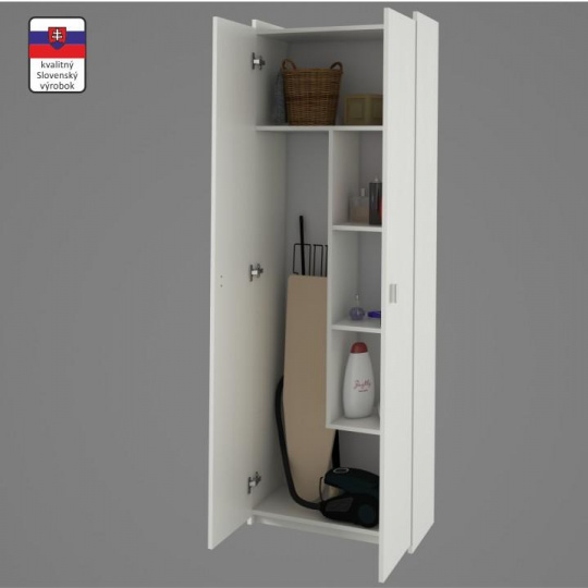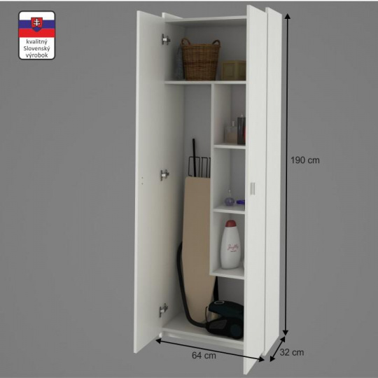 Materiál: laminovaná DTD Barva: bílá Rozměry (ŠxHxV): 64x32x190 cm Skříňka (ŠxHxV): 64x30x63,6 cm Šířka dvířek: 31,6 cm Regálová police (ŠxHxV): 64x32x123 cm Výška mezi policemi: 36,2 cm Prostor na pračku (ŠxHxV): 60,8x32x85,2 cm Přečnívající část nad skříňkou: 4 cm Tloušťka materiálu: 16 mm S policemi Dvoudveřová skříňka Kvalitní slovens