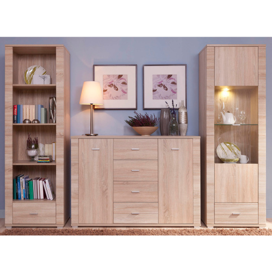 Regál GRAND typ 6 Materiál: DTD laminovaná. Barevné provedení: dub sonoma. Rozměry (ŠxHxV): 62,8x39x192 cm Tloušťka materiálu korpus: 16 mm Tloušťka materiálu vrchní desky: 22 mm Tloušťka materiálu spodní desky: 22 mm 1-šuplík 3-police Dodáván v demontu.