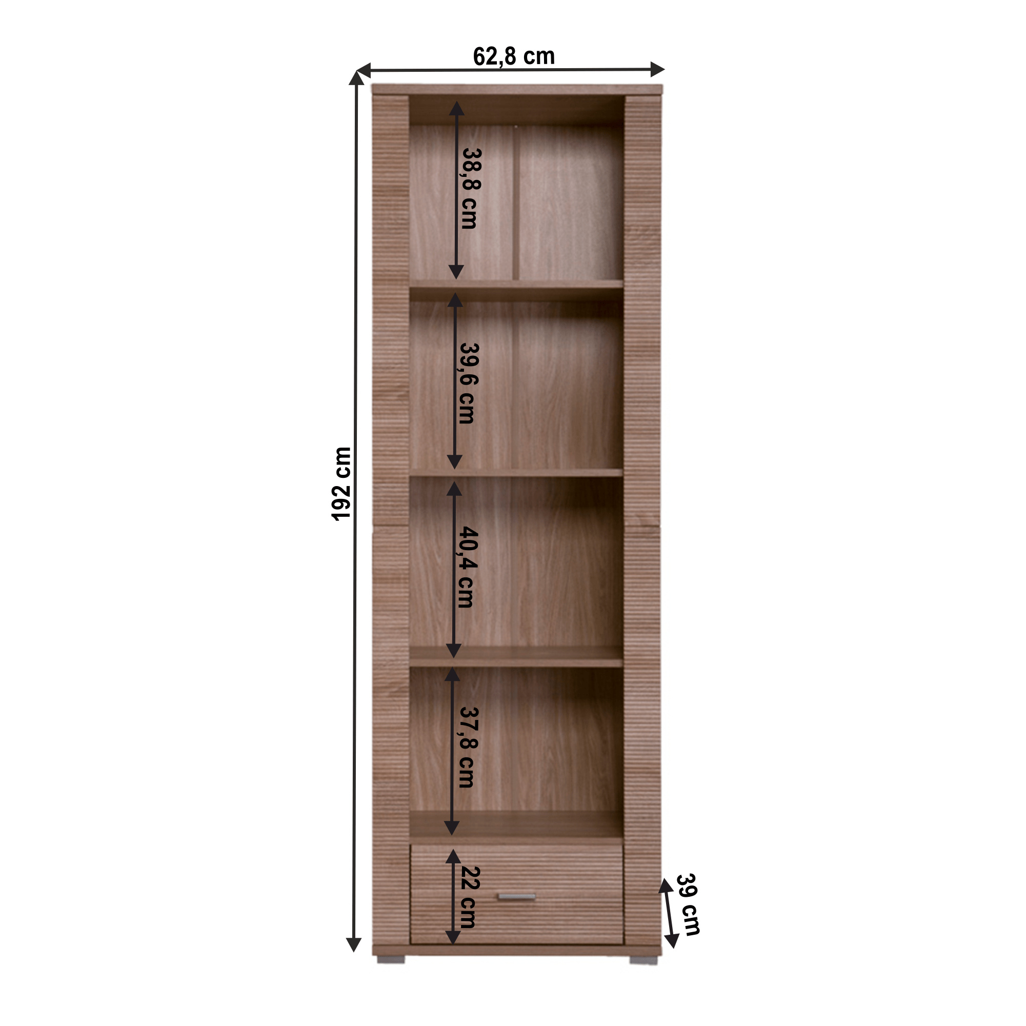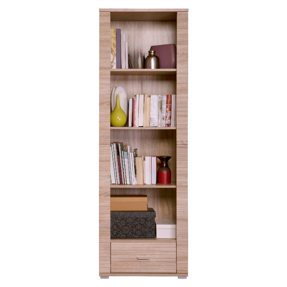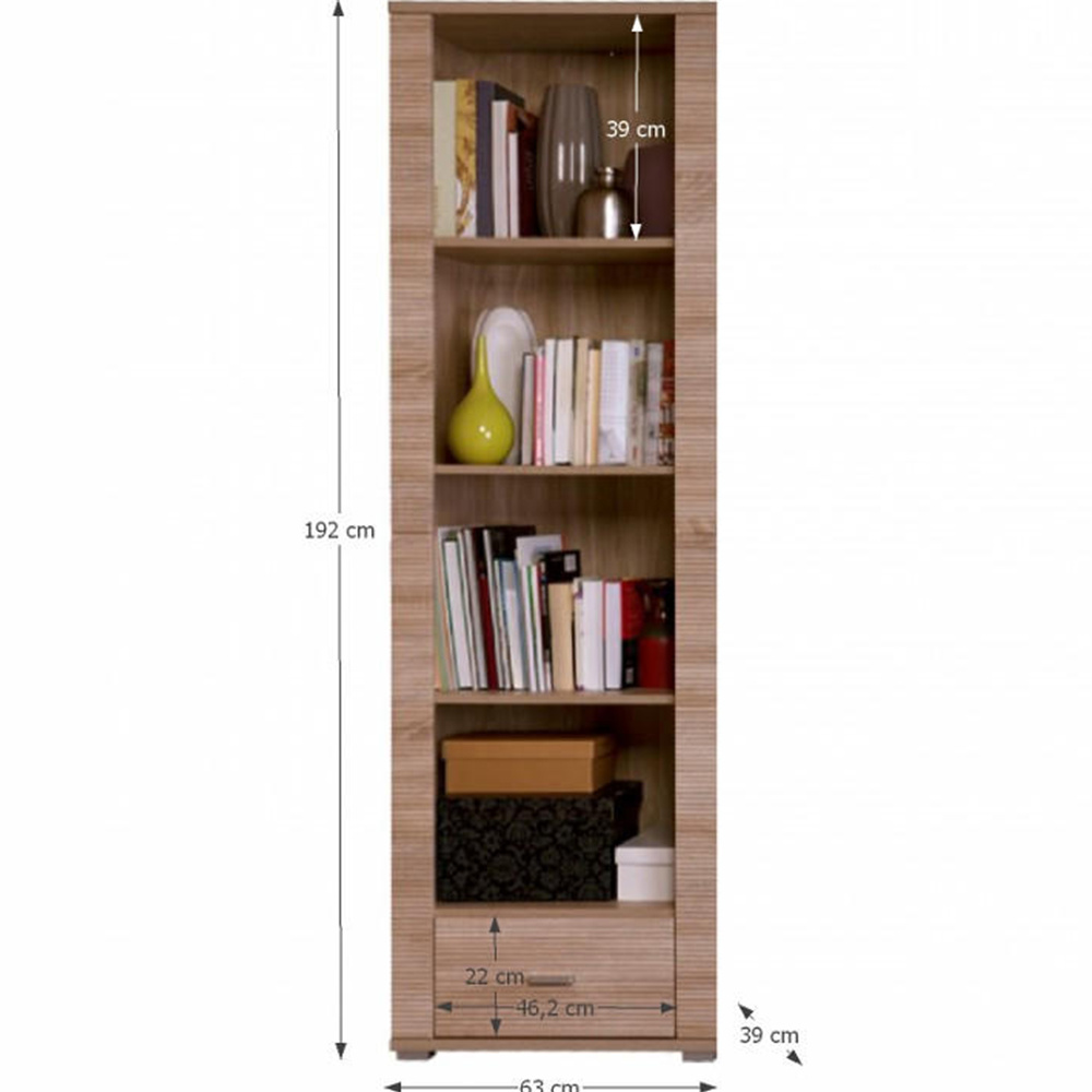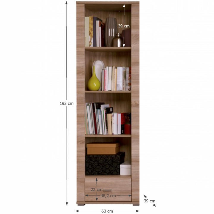 Regál GRAND typ 6 Materiál: DTD laminovaná. Barevné provedení: dub sonoma. Rozměry (ŠxHxV): 62,8x39x192 cm Tloušťka materiálu korpus: 16 mm Tloušťka materiálu vrchní desky: 22 mm Tloušťka materiálu spodní desky: 22 mm 1-šuplík 3-police Dodáván v demontu.