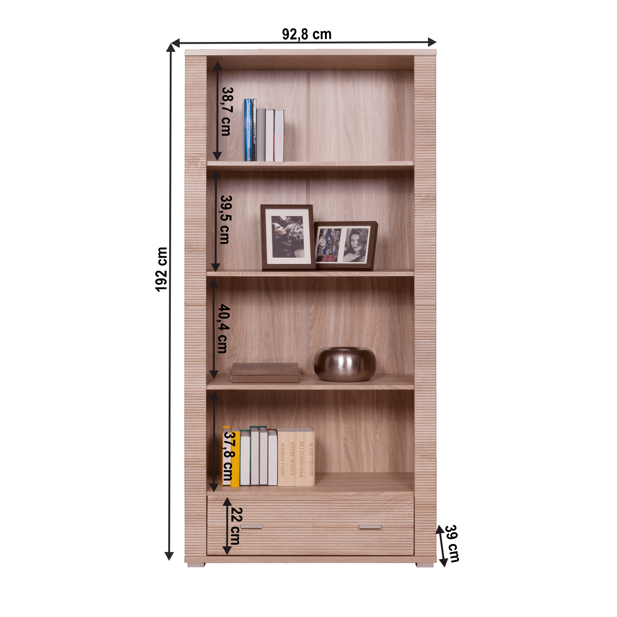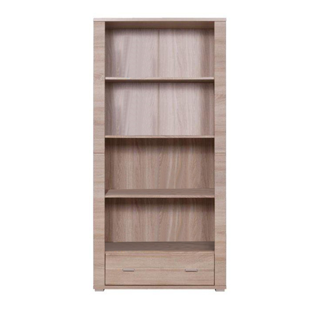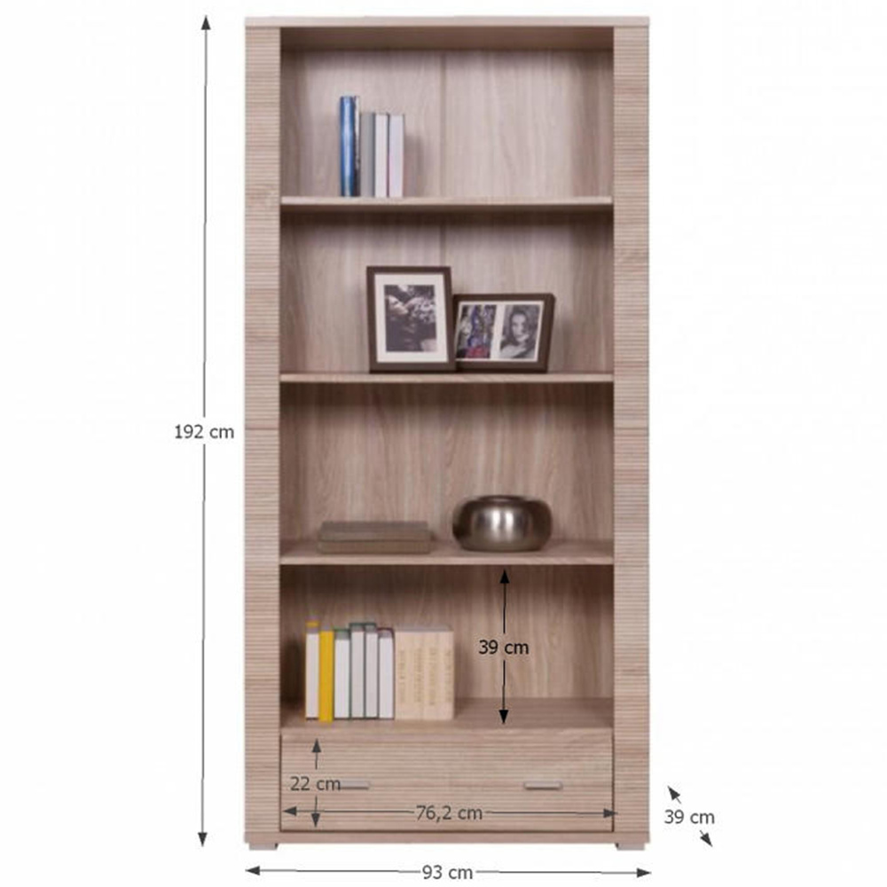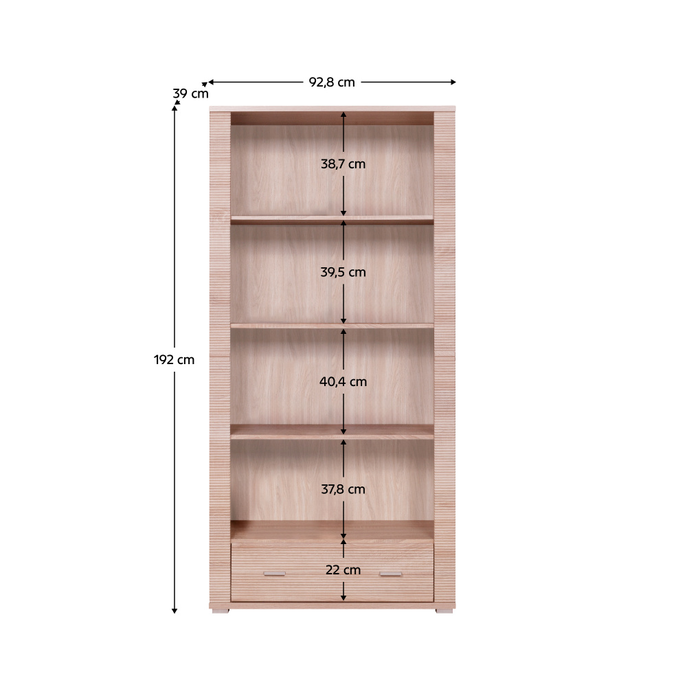 Regál, dub sonoma, GRAND TYP 7 Materiál: DTD laminovaná Barevné provedení: dub sonoma Rozměry (ŠxHxV): 92,8x39x192 cm Tloušťka korpusu: 16 mm Tloušťka vrchní desky: 22 mm Tloušťka spodní desky: 22 mm Hrany ukončené vroubkovanou lištou policový se šuplíkem Dodávané v demontu.