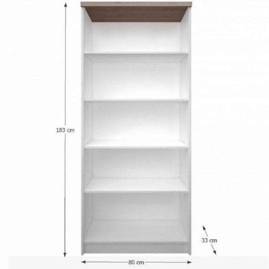 regál otevřený Materiál: DTD laminovaná Provedení: bílá / dub sonoma Rozměry (ŠxHxV): 80x33x183 cm Tloušťka materiálu korpus: 16 mm Tloušťka materiálu vrchní desky: 32 mm Moderní sektorový systém vhodný na zařízení kanceláří, pracoven, obývacích prostorů či předsíní