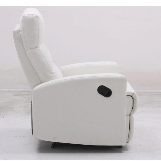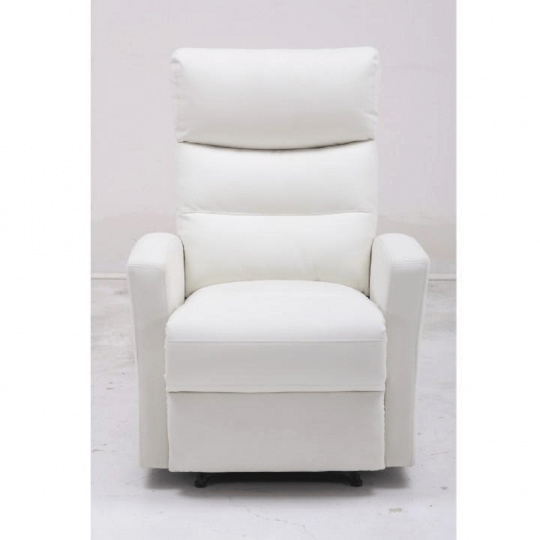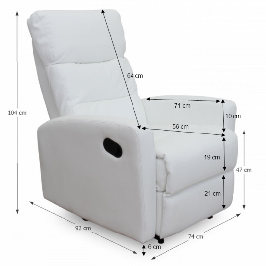 Relaxační polohovatelné křeslo. Materiál: ekokůže Oděruodolnost textilie podle testu Martindale: 100 000 oděrek Barva: bílá Rozměry (ŠxHxV): 74x92x104 cm Výška sedu: 47cm Nosnost: 150 kg Hmotnost: 33 kg. Dodávané v demontu.