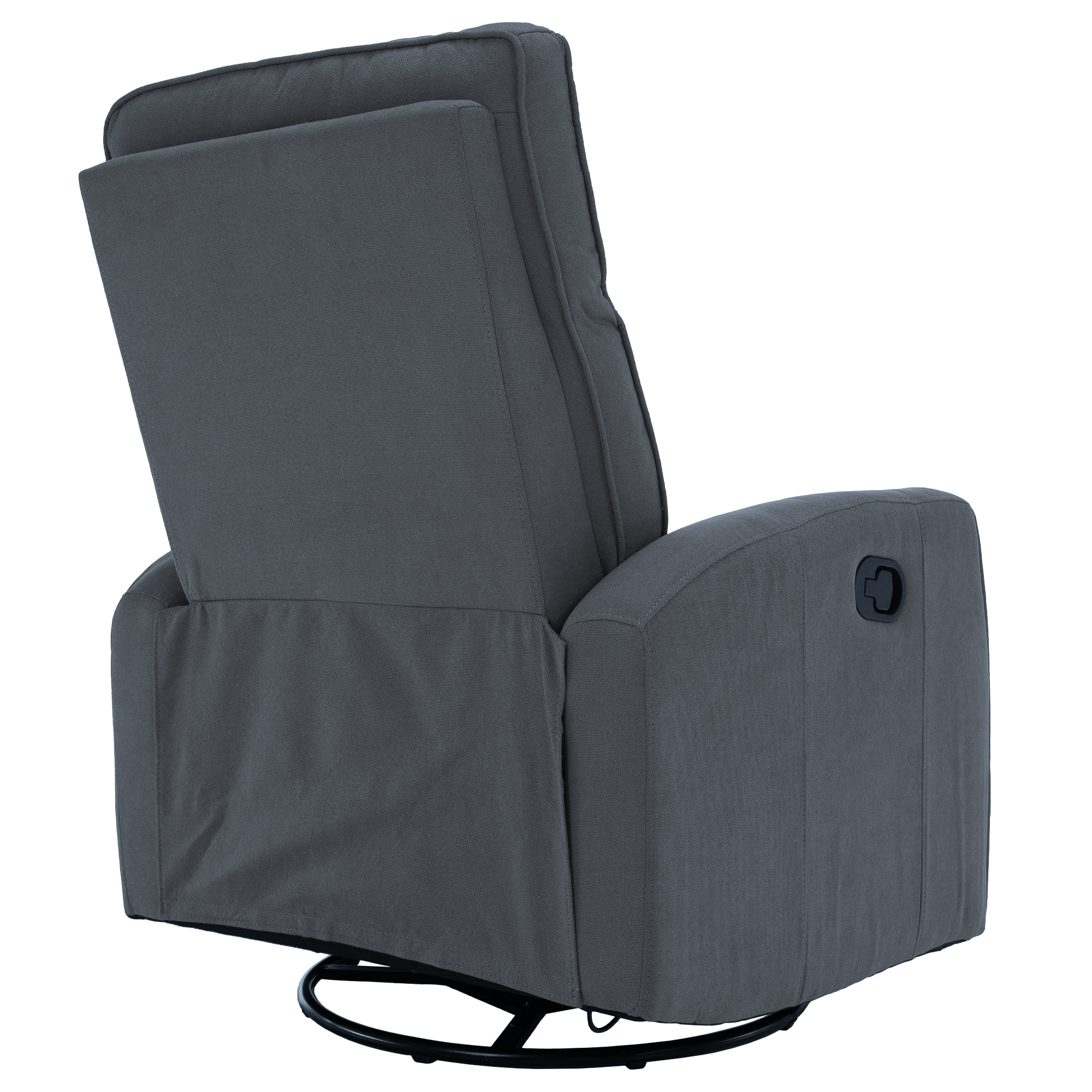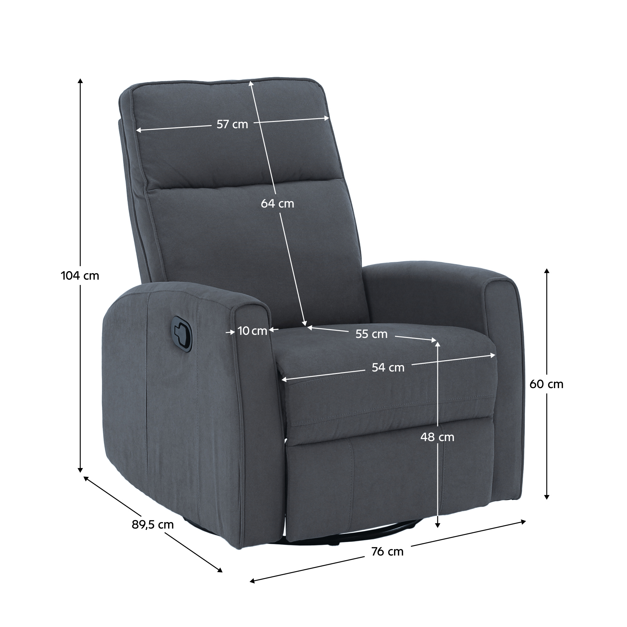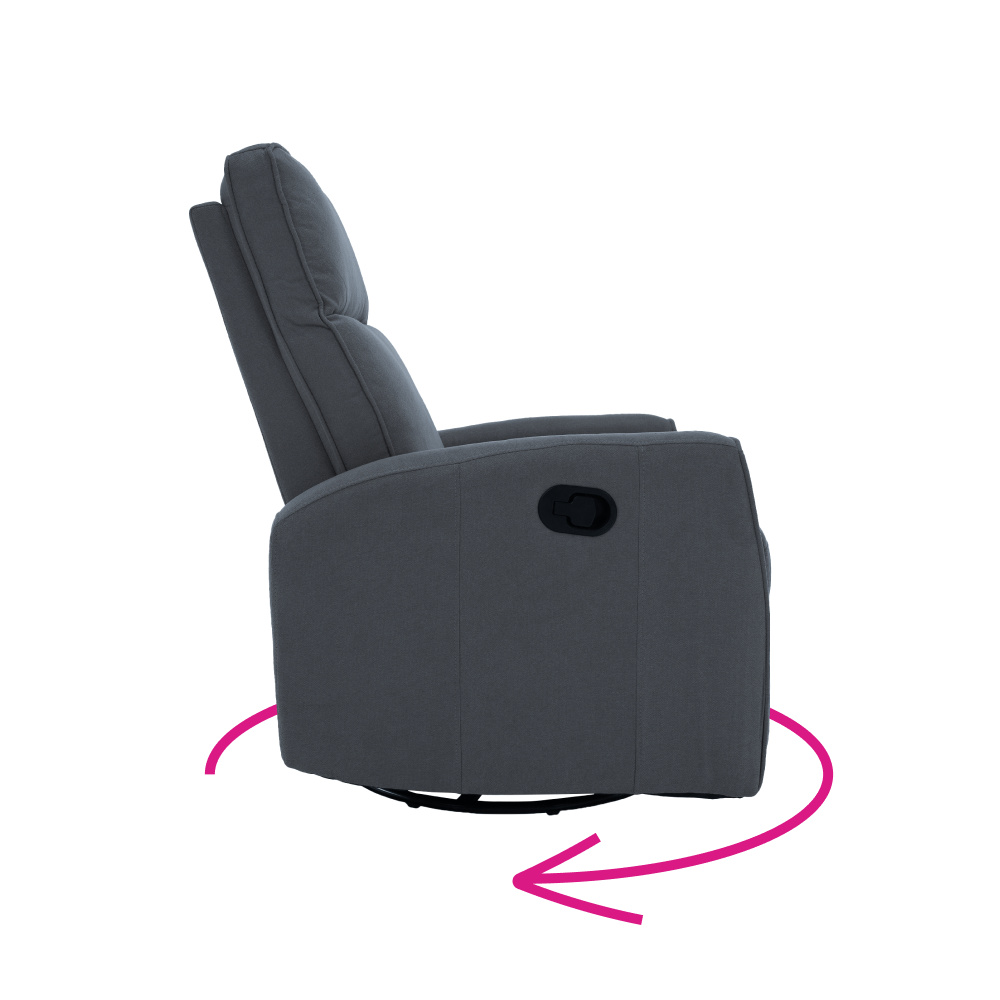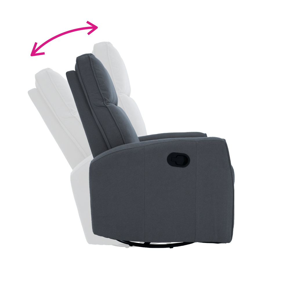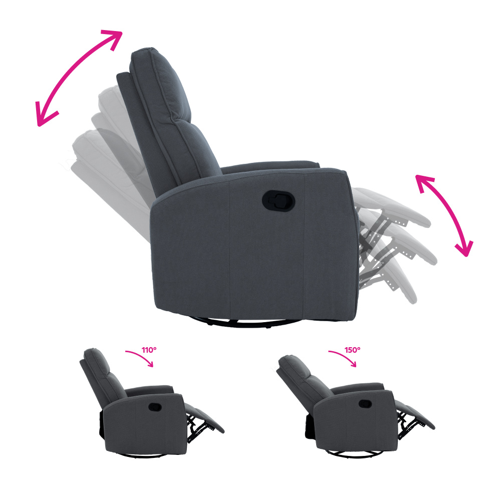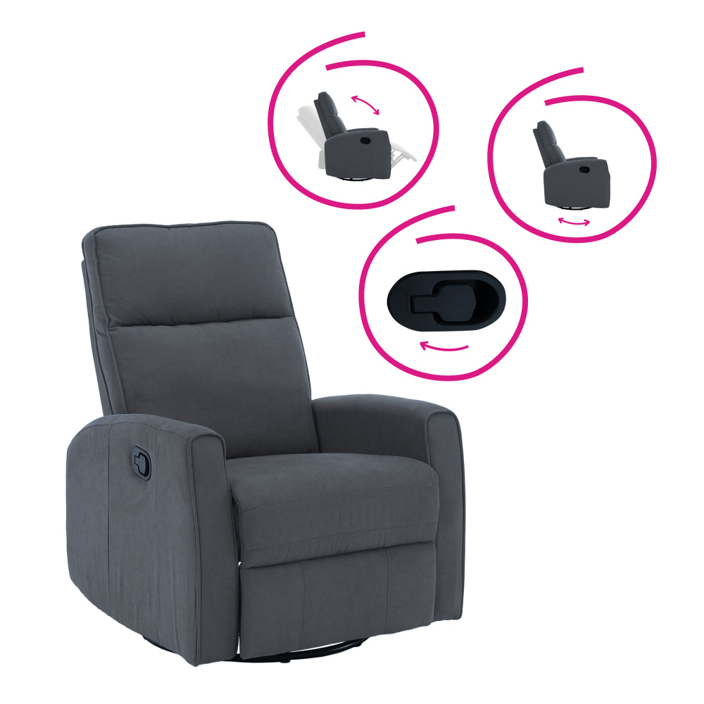 Materiál: bavlněná látka Barva: šedá Rozměry (ŠxHxV): 76x89,5x104 cm Výška sedu: 48 cm Hloubka sedu: 55 cm Výška opěrky zad: 64 cm Rozměr opěrky na ruku (ŠxV): 10x60 cm Nosnost: 120 kg Polohovací Rám z ocelové konstrukce Výplň: pěna Jednoduchý mechanismus pro sklápění opěradla Relaxační Otočné Funkce houpání Dodáváno v demontu