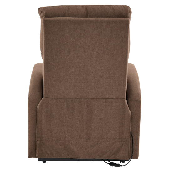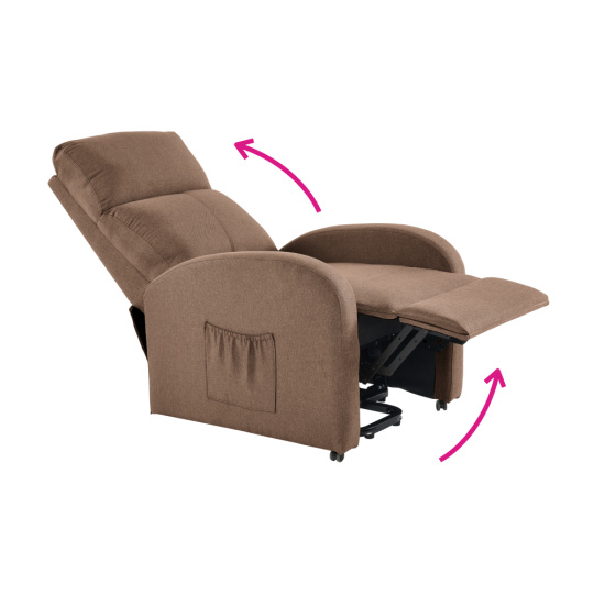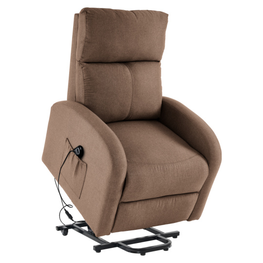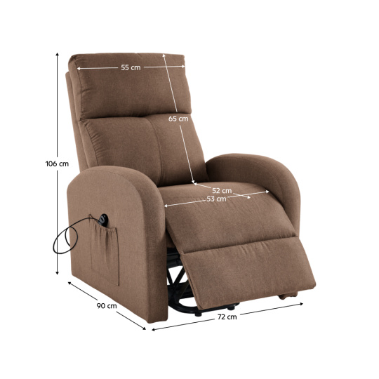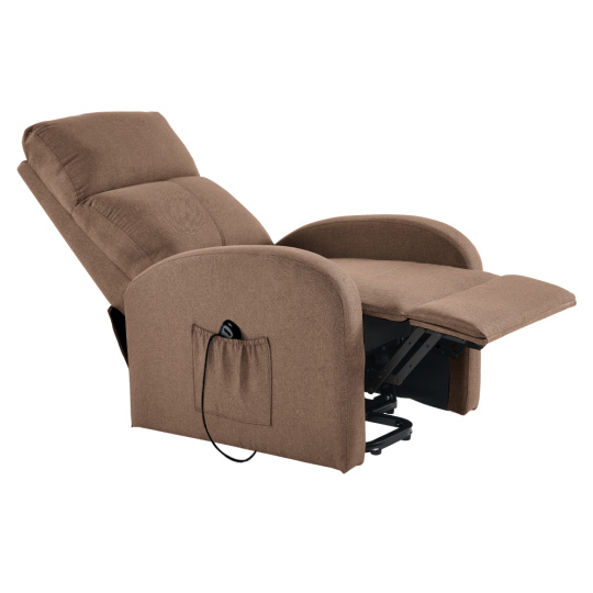 Materiál: ocel/látka Oděruodolnost textilie podle testu Martindale: 50 000 oděrů Výplň: pěna o vysoké hustotě 240D Barva: světle hnědá Rozměry (ŠxHxV): 72x90-161x86-105 cm Výška sedu: 49 cm Hloubka sedu: 52 cm Šířka sedu: 53 cm Šířka zad: 55 cm Výška zádové opěrky: 65 cm Nosnost: 150 kg Polohovací Relaxační Mechanismus vyklápění podnože a zad Zvedací křeslo Dodáváno s dálkovým ovládáním Délka síťového kabelu: 2,5 cm Napětí: 100-240V Dodáváno v demontu