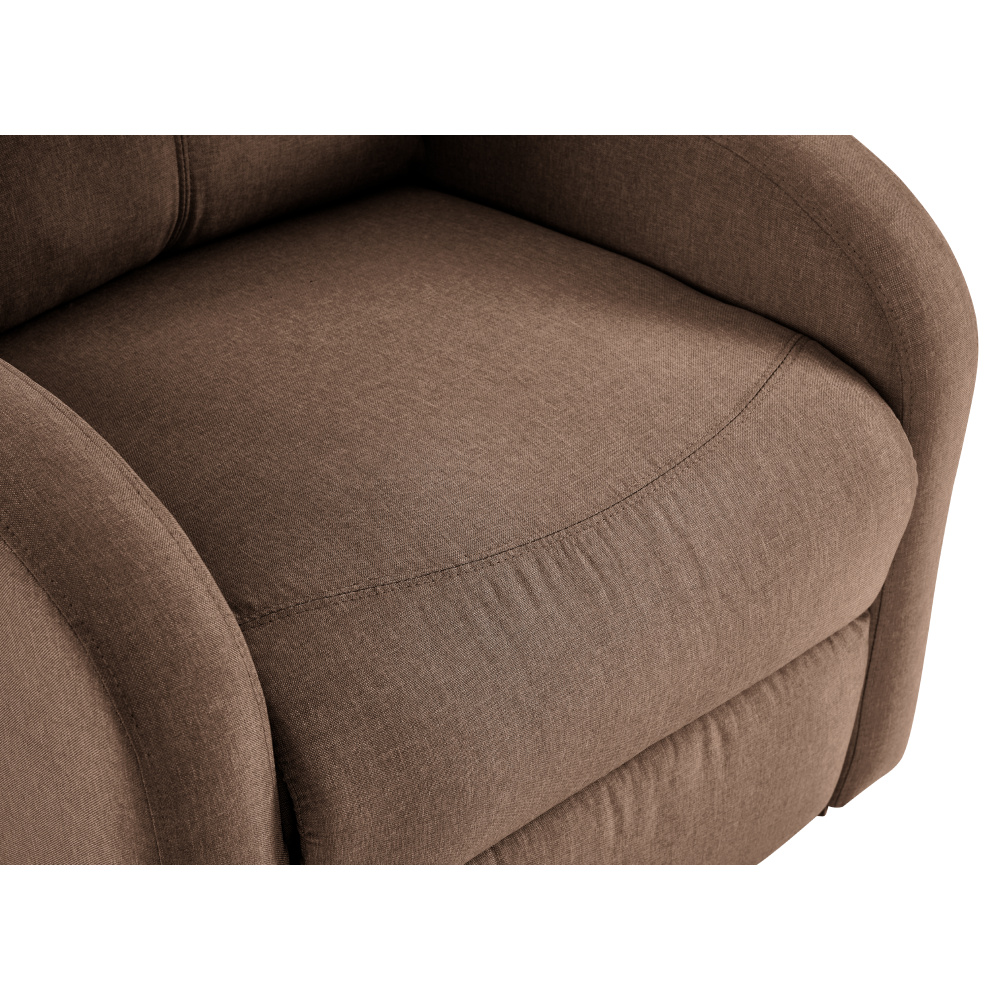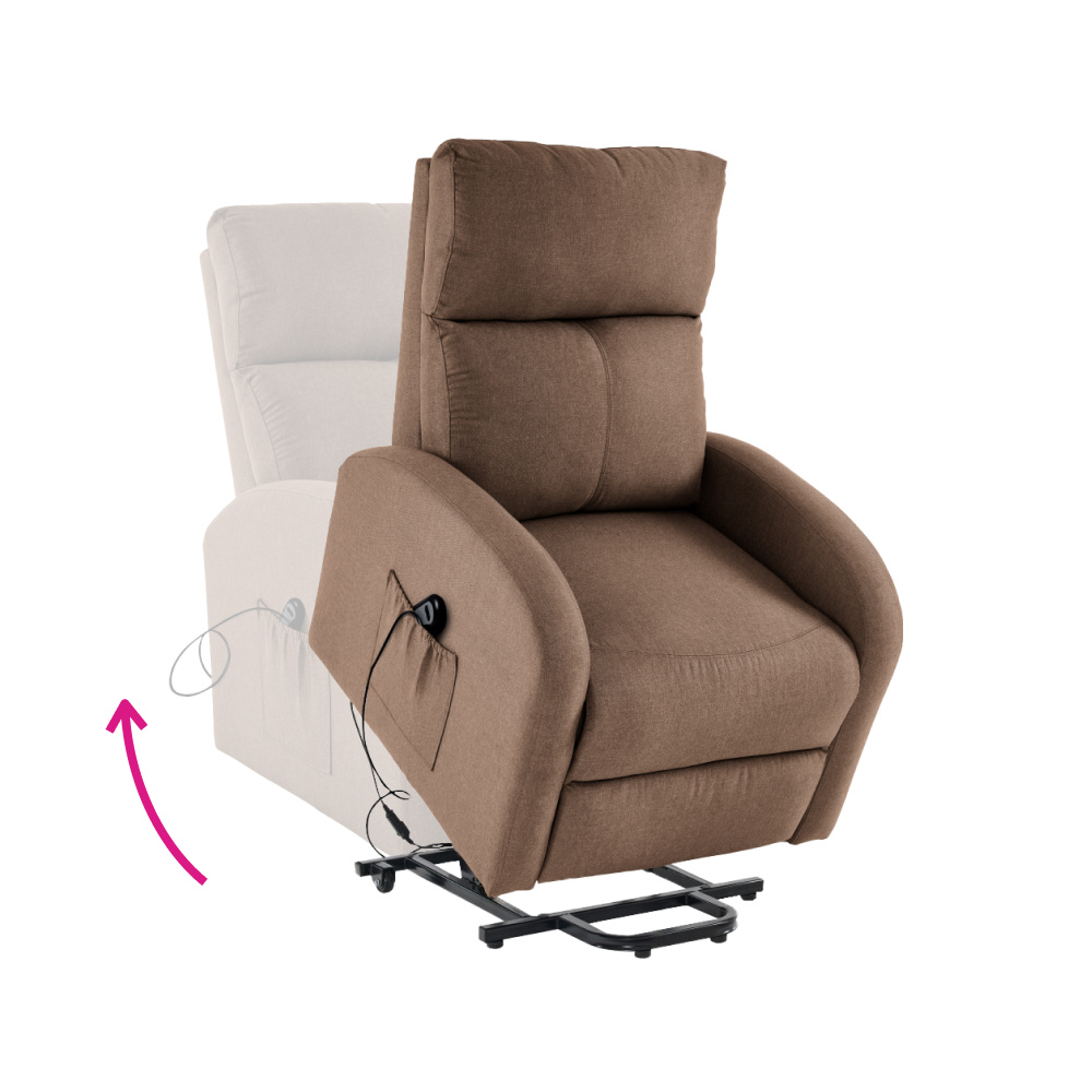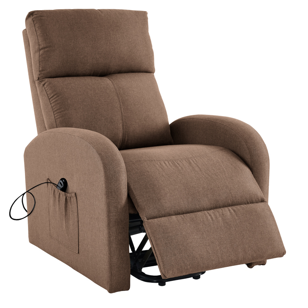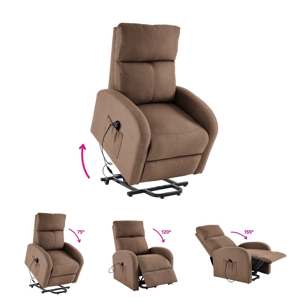 Materiál: ocel/látka Oděruodolnost textilie podle testu Martindale: 50 000 oděrů Výplň: pěna o vysoké hustotě 240D Barva: světle hnědá Rozměry (ŠxHxV): 72x90-161x86-105 cm Výška sedu: 49 cm Hloubka sedu: 52 cm Šířka sedu: 53 cm Šířka zad: 55 cm Výška zádové opěrky: 65 cm Nosnost: 150 kg Polohovací Relaxační Mechanismus vyklápění podnože a zad Zvedací křeslo Dodáváno s dálkovým ovládáním Délka síťového kabelu: 2,5 cm Napětí: 100-240V Dodáváno v demontu