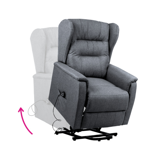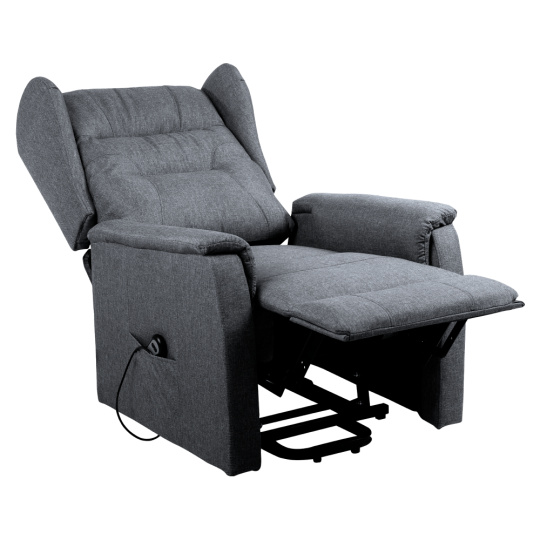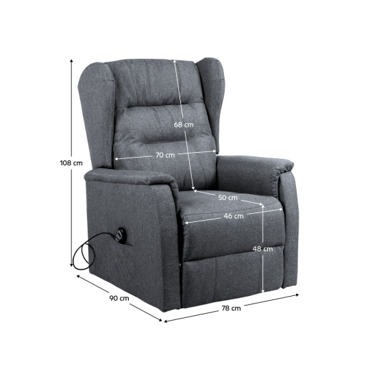 Materiál: ocel/látka Oděruodolnost textilie podle testu Martindale: 50 000 Výplň: pěna o vysoké hustotě 240D Barva: světle šedá Rozměry (ŠxHxV): 78x90-162x86-108 cm Výška sedu: 48 cm Hloubka sedu: 50 cm Šířka sedu: 46 cm Šířka zad: 70 cm Výška zádové opěrky: 68 cm Nosnost: 150 kg Polohovací Relaxační Mechanismus vyklápění podnože a zad Zvedací křeslo Dodáváno s dálkovým ovládáním Délka síťového kabelu: 2,5 cm Napětí: 100-240V Dodáváno v demontu