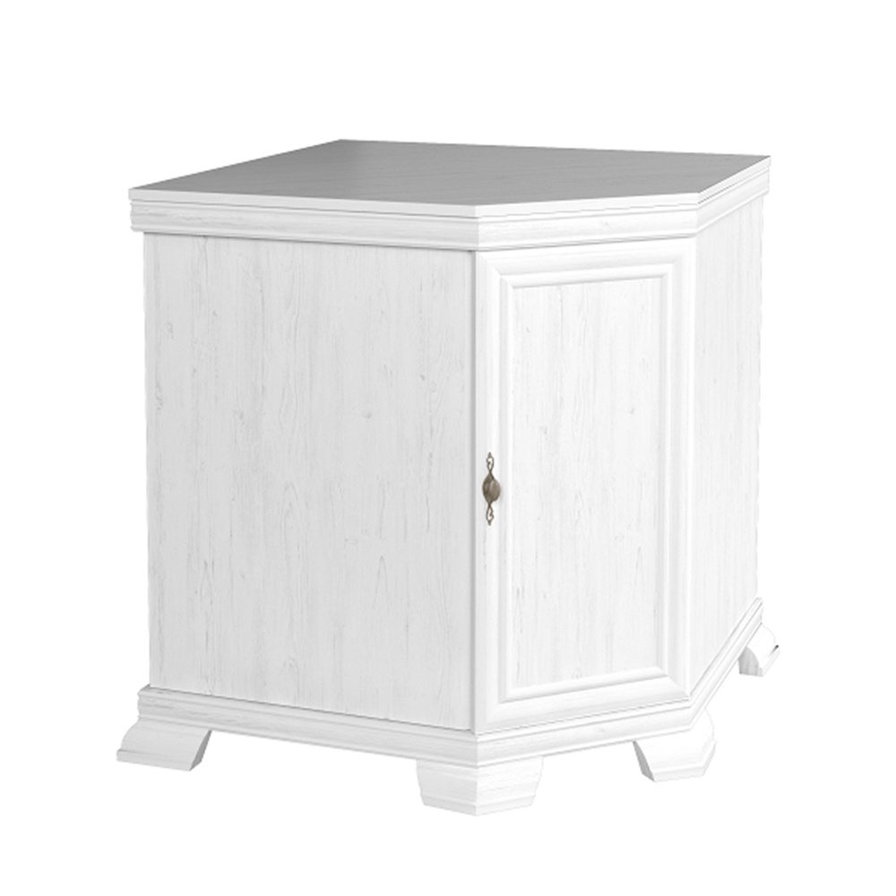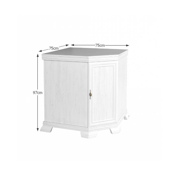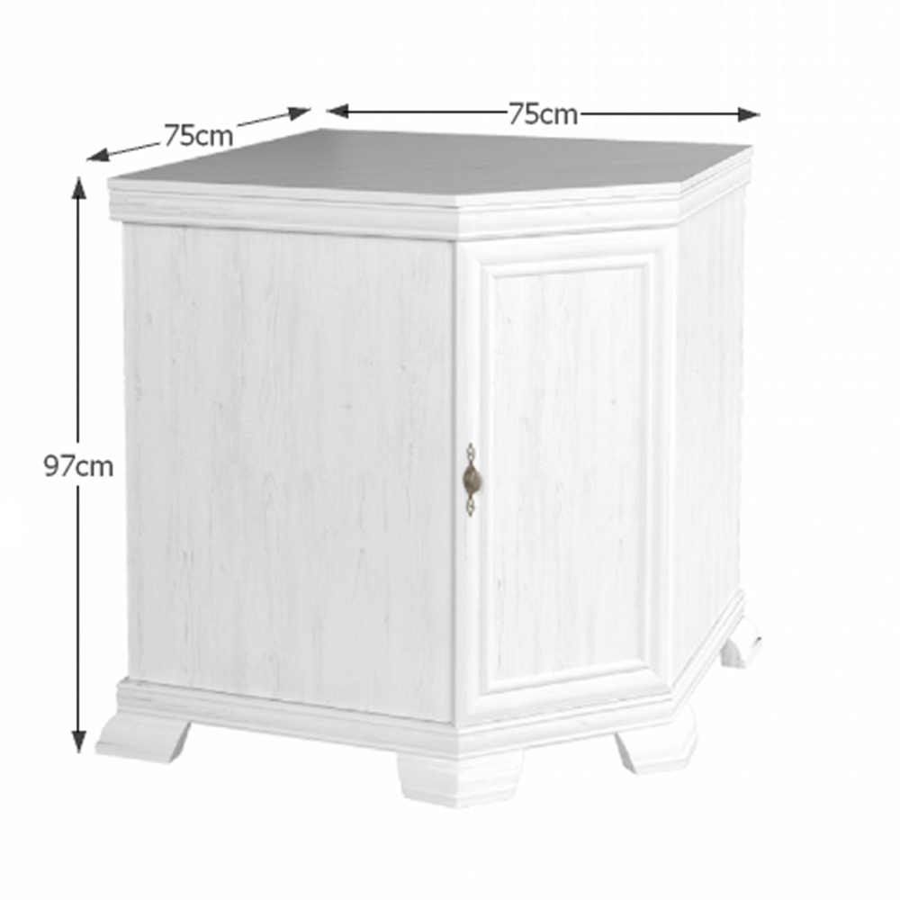 Rohová komoda KKN1 KORA. Barevné provedení sosna andersen. Materiál laminovaná DTD, MDF, kov. Rozměry (ŠxHxV): 75x75x97 cm Tloušťka materiálu korpus: 15 mm Tloušťka materiálu vrchní desky: 22 mm Tloušťka materiálu dolní desky: 22 mm Výška spodního prostoru od podlahy: 10,5 cm