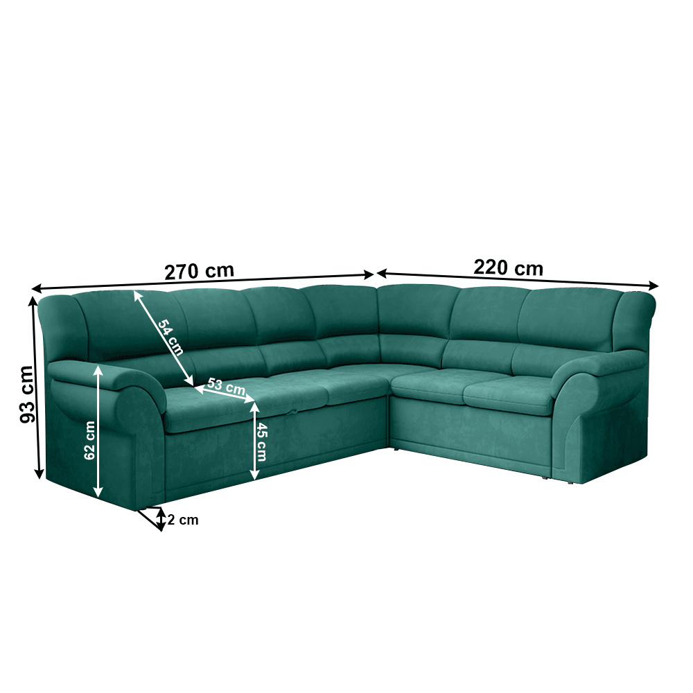 Materiál: látka Monolith, 100% polyester Oděruodolnost textilie podle testu Martindale: 100 000 oděrek Barva: smaragdová Rozměry (ŠxHxV): 270x220x93 cm rozkládací Plocha na spaní (ŠxD): 120x200 cm Výška sedu: 45 cm Hloubka sedu: 53 cm Výška zádové opěrky: 54 cm Výška loketní opěrky: 62 cm Výška spodního prostoru od podlahy: 2 cm Nosnost na osobu: 90 kg rohová pravé provedení Výplň: jádro z PUR pěny a pružiny faliste S úložným prostorem Dodávána v demontu Možnost objednání ve 3 barevných provedeních látky Hugo/Inari nebo v 6 barevných provedeních látky Monolith v ceně 30.790 Kč. Při individuální objednávce je třeba zaplatit 20% zálohu z dané částky. Po uhrazení zálohy bude Váš požadavek zadána do výroby. Doba dodání 6-8 týdnů.