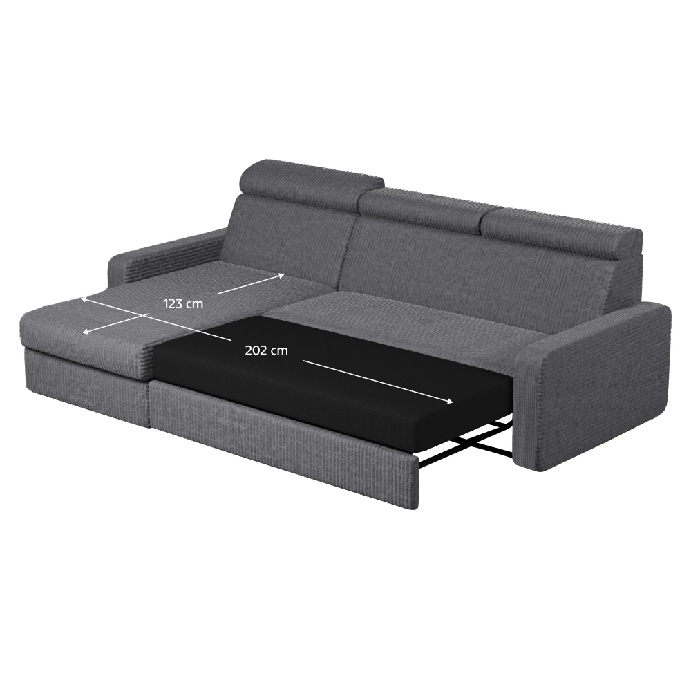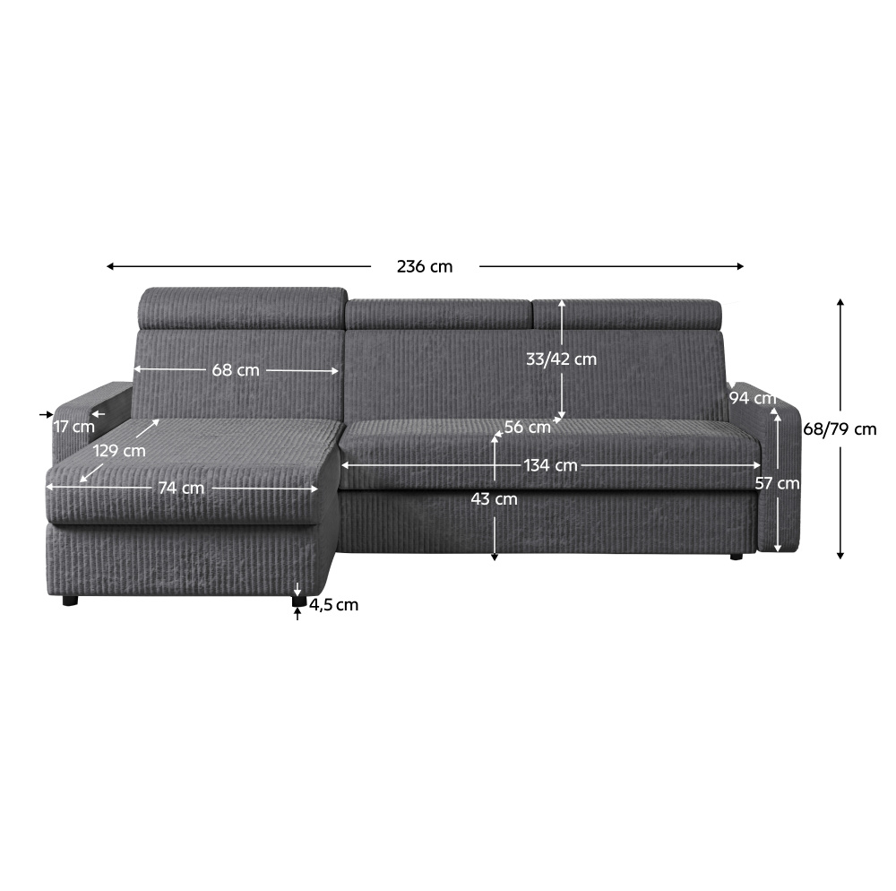 Materiál: látka Poso 60 Oděruodolnost textilie podle testu Martindale: 90 000 oděrů Barva: šedá Rozměry (ŠxHxV): 236x170x68/79 cm Plocha na spaní (ŠxD): 123x202 cm Výška sedu: 43 cm Hloubka sedu: 56 cm Rozměry otomanu (ŠxH): 74x129 cm Rozměry opěrky na ruku (ŠxHxV): 17x94x57 cm Šířka sedáku: 134 cm Levé provedení Celočalouněná Rozkládací Rohová S úložným prostorem Na nožičkách Materiál nožiček: plast Barva nožiček: černá Výška spodního prostoru od podlahy: 4,5 cm Výplň: pružina falista/pur pěna Polohovatelné opěrky hlavy 6 stupňové polohování opěrek Praktická Moderní Dodáváno v demontu