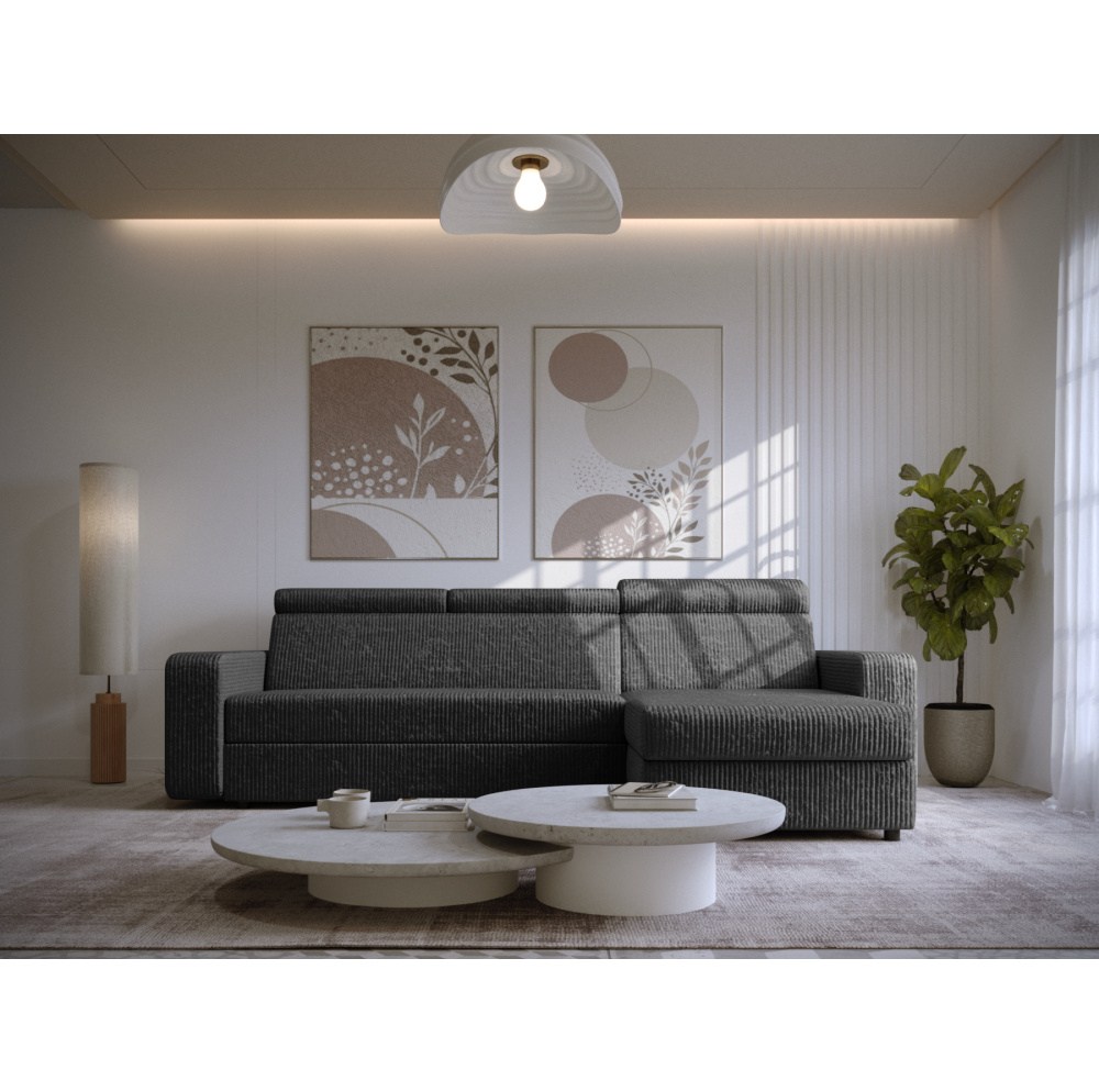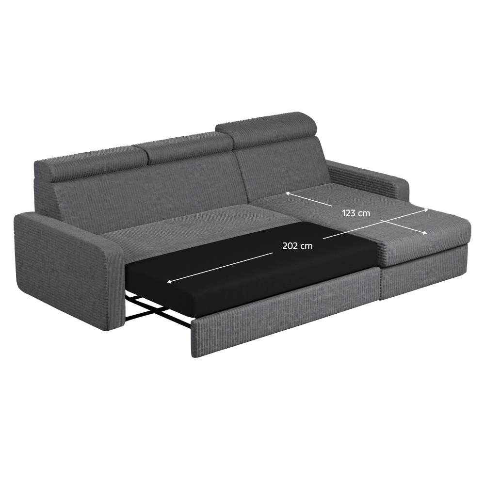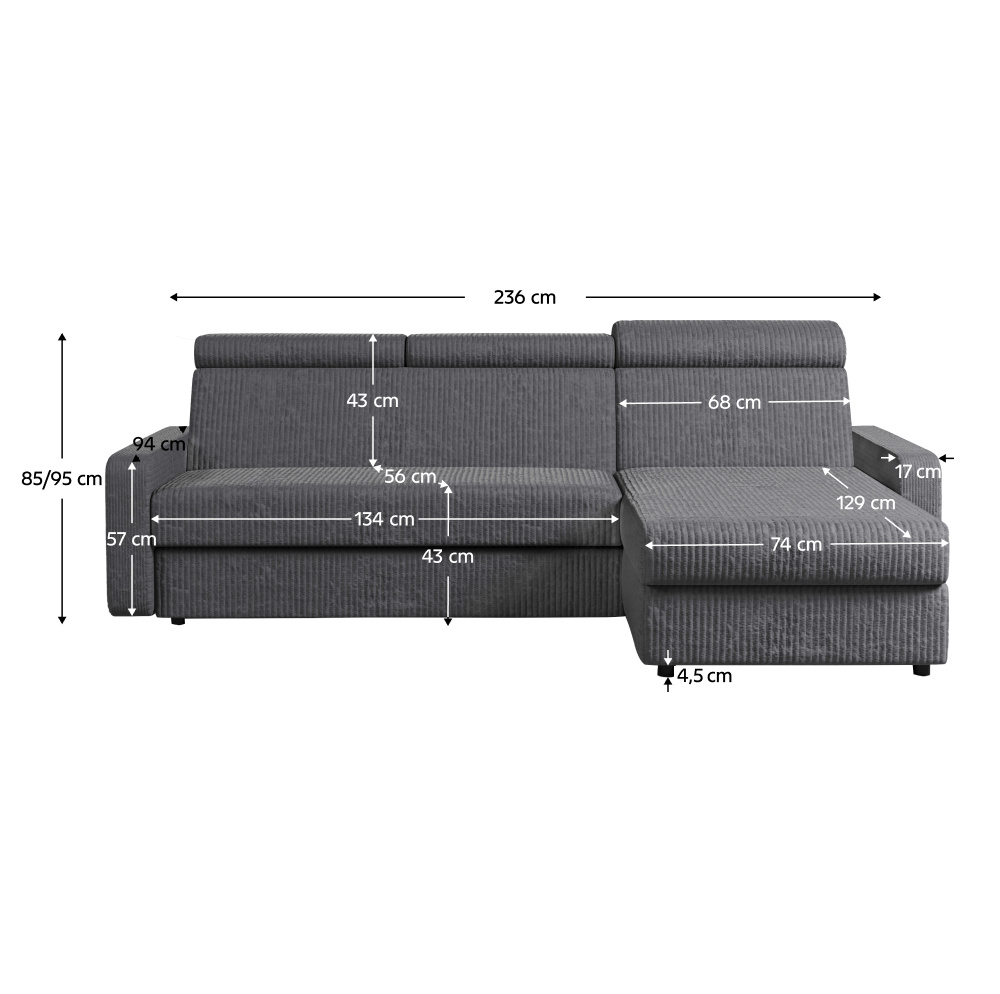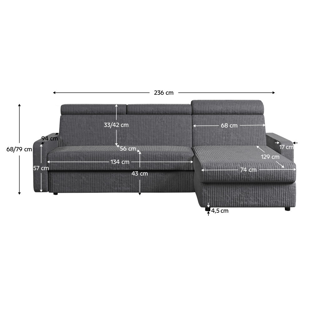 Materiál: látka Poso 60 Oděruodolnost textilie podle testu Martindale: 90 000 oděrů Barva: šedá Rozměry (ŠxHxV): 236x170x68/79 cm Plocha na spaní (ŠxD): 123x202 cm Výška sedu: 43 cm Hloubka sedu: 56 cm Rozměry otomanu (ŠxH): 74x129 cm Rozměry opěrky na ruku (ŠxHxV): 17x94x57 cm Šířka sedáku: 134 cm Pravé provedení Celočalouněná Rozkládací Rohová S úložným prostorem Na nožičkách Materiál nožiček: plast Barva nožiček: černá Výška spodního prostoru od podlahy: 4,5 cm Výplň: pružina falista/pur pěna Polohovatelné opěrky hlavy 6 stupňové polohování opěrek Praktická Moderní Dodáváno v demontu