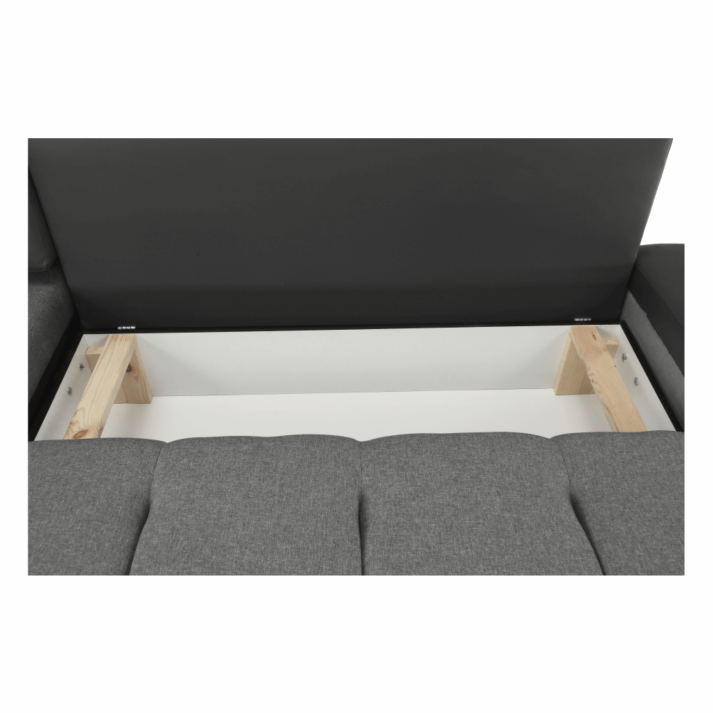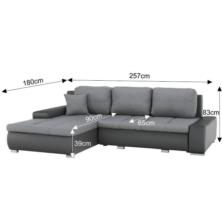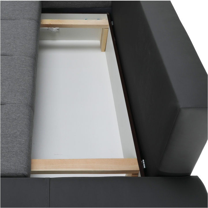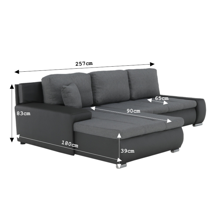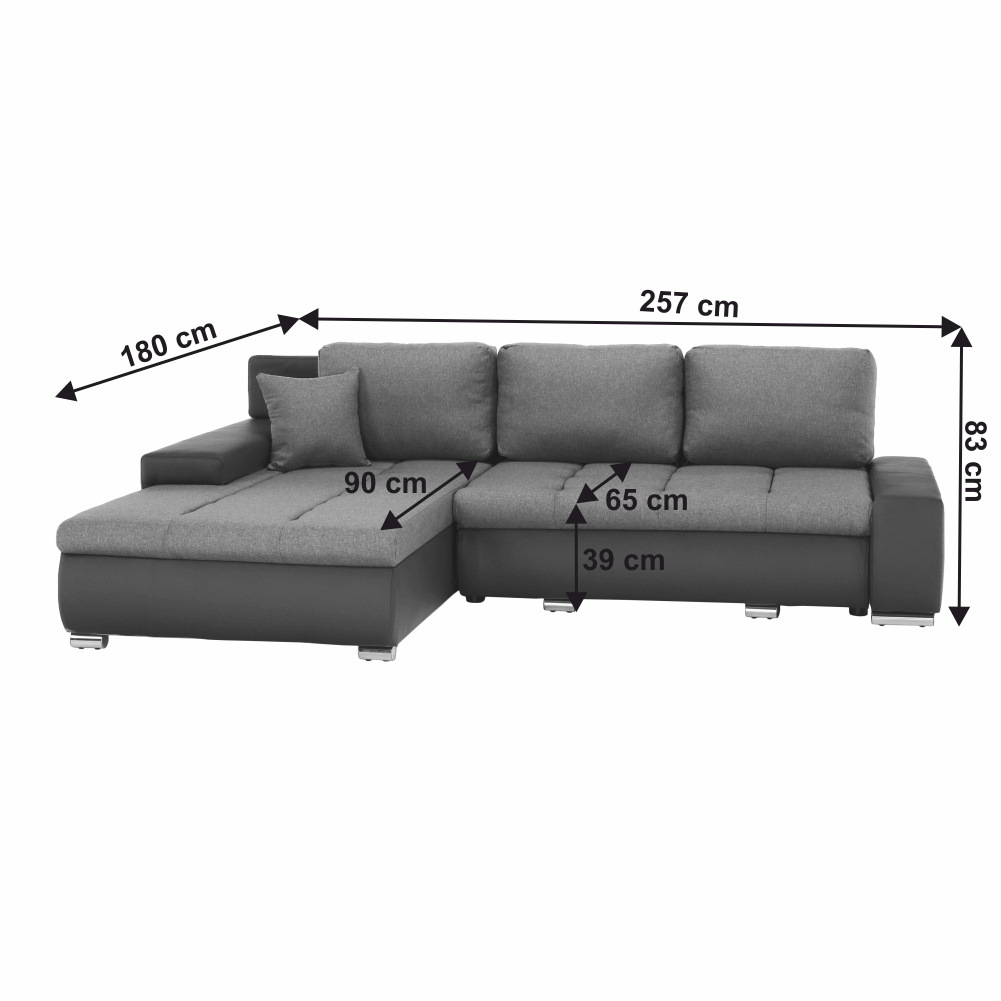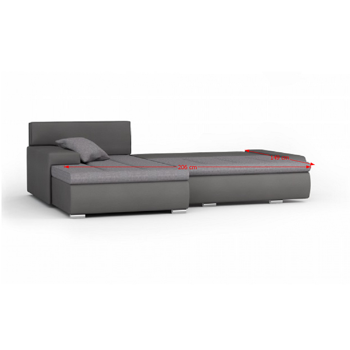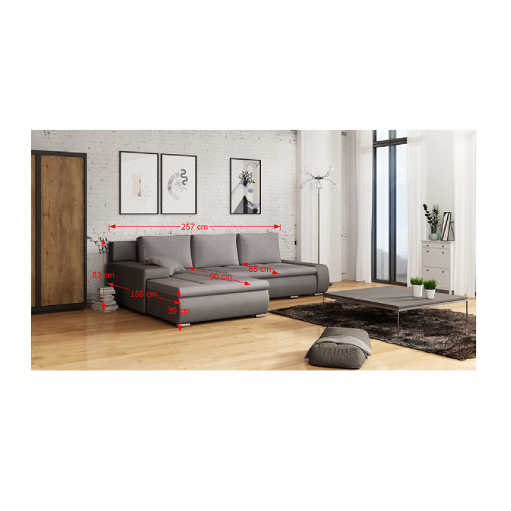 Univerzální (L / P) rohová rozkládací sedací souprava s úložným prostorem Materiál: látka SAVANA/ ekokůže Barva: šedá Rozměry (ŠxHxV): 257x180x83 cm, spaní: (ŠxD): 149x206 cm Výška spodního prostoru od podlahy: 5 cm Dodávané v demontu