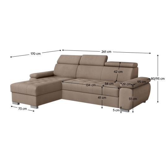 Materiál: látka Paros 3 Oděruodolnost textilie podle testu Martindale: 50 000 oděrů Barva: šedobéžová Taupe Rozměry (ŠxHxV): 261x170x80/95 cm Plocha na spaní (ŠxD): 123x202 cm Výška sedu: 41 cm Hloubka sedu: 54 cm Rozměry otomanu (ŠxH): 73x170 cm Rozměry opěrky na ruku (ŠxHxV): 29x95x51 cm Šířka sedáku: 134 cm Levé provedení Celočalouněná Rozkládací Rohová S úložným prostorem Na nožičkách Materiál nožiček: plast Barva nožiček: stříbrná Výška spodního prostoru od podlahy: 5 cm Výplň: pružina falista/pur pěna Polohovatelné opěrky hlavy 6stupňové polohování opěrek Praktická Moderní Dodáváno v demontu Nabízíme vám možnost vybrat si ze 6 barevných provedení látky Kronos nebo ze 2 barevných provedení látky Paros za cenu 26 690 Kč. Při individuální objednávce je třeba zaplatit 20% zálohu z dané částky. Po uhrazení zálohy bude Váš požadavek zadán do výroby. Dodací lhůta 6-8 týdnů.