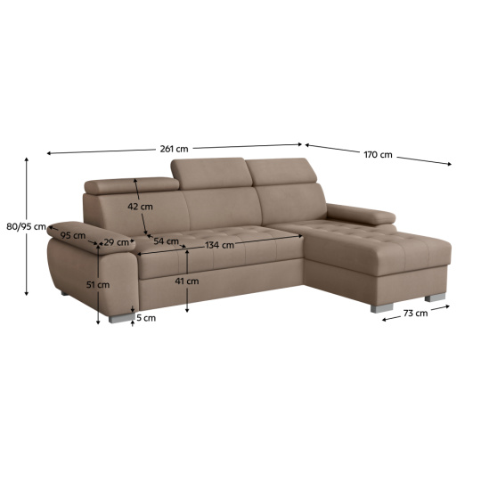 Materiál: látka Paros 3 Oděruodolnost textilie podle testu Martindale: 50 000 oděrů Barva: šedobéžová Taupe Rozměry (ŠxHxV): 261x170x80/95 cm Plocha na spaní (ŠxD): 123x202 cm Výška sedu: 41 cm Hloubka sedu: 54 cm Rozměry otomanu (ŠxH): 73x170 cm Rozměry opěrky na ruku (ŠxHxV): 29x95x51 cm Šířka sedáku: 134 cm Pravé provedení Celočalouněná Rozkládací Rohová S úložným prostorem Na nožičkách Materiál nožiček: plast Barva nožiček: stříbrná Výška spodního prostoru od podlahy: 5 cm Výplň: pružina falista/pur pěna Polohovatelné opěrky hlavy 6 stupňové polohování opěrek Praktická Moderní Dodáváno v demontu Nabízíme vám možnost vybrat si ze 6 barevných provedení látky Kronos nebo ze 2 barevných provedení látky Paros za cenu 26 690 Kč. Při individuální objednávce je třeba zaplatit 20% zálohu z dané částky. Po uhrazení zálohy bude Váš požadavek zadán do výroby. Dodací lhůta 6-8 týdnů.