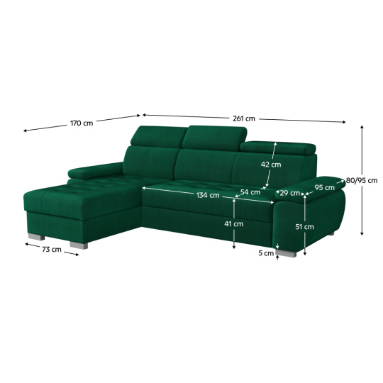 Materiál: látka Kronos 14 Oděruodolnost textilie podle testu Martindale: 60 000 oděrů Barva: zelená Rozměry (ŠxHxV): 261x170x80/95 cm Plocha na spaní (ŠxD): 123x202 cm Výška sedu: 41 cm Hloubka sedu: 54 cm Rozměry otomanu (ŠxH): 73x170 cm Rozměry opěrky na ruku (ŠxHxV): 29x95x51 cm Šířka sedáku: 134 cm Levé provedení Celočalouněná Rozkládací Rohová S úložným prostorem Na nožičkách Materiál nožiček: plast Barva nožiček: stříbrná Výška spodního prostoru od podlahy: 5 cm Výplň: pružina falista/pur pěna Polohovatelné opěrky hlavy 6 stupňové polohování opěrek Praktická Moderní Dodáváno v demontu Nabízíme vám možnost vybrat si ze 6 barevných provedení látky Kronos nebo ze 2 barevných provedení látky Paros za cenu 26 690 Kč.. Při individuální objednávce je třeba zaplatit 20% zálohu z dané částky. Po uhrazení zálohy bude Váš požadavek zadán do výroby. Dodací lhůta 6-8 týdnů.