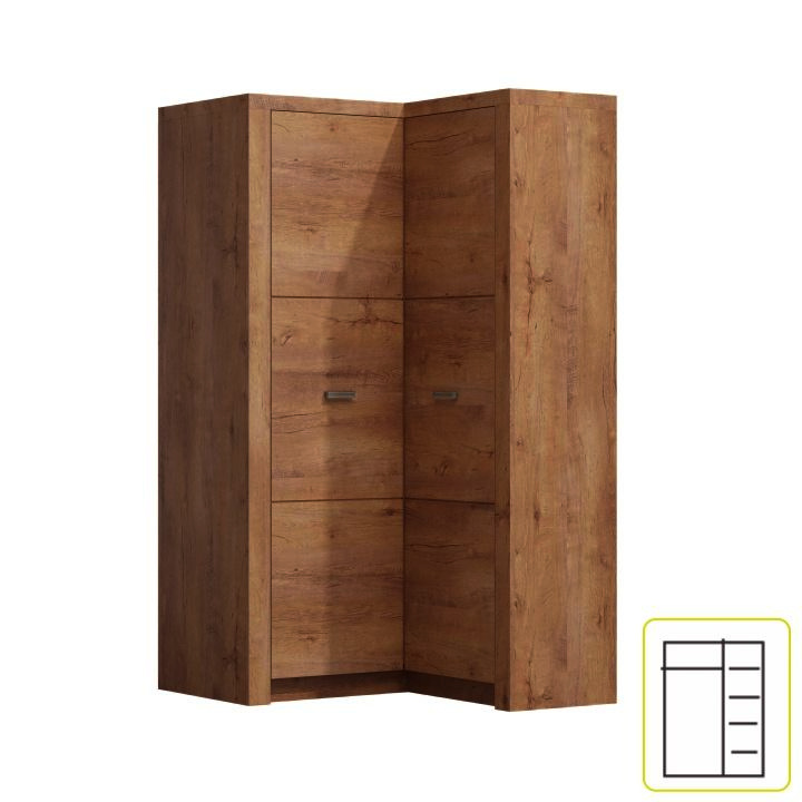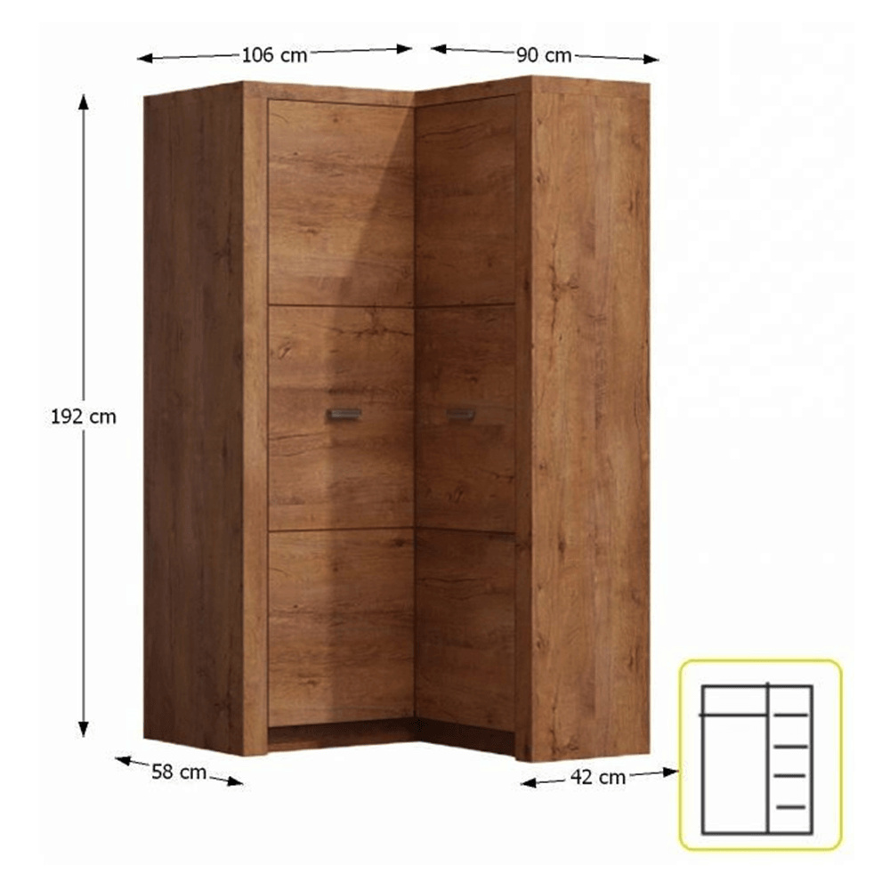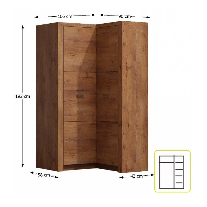 Rohová skříň INFINITY 14 Korpus hrubý až 48 mm, Tloušťka materiálu zbývající části: 16 mm, úchytky kovové Materiál DTD laminovaná, ABS hrany, barevné provedení: jasan světlý, Rozměry ŠxHxV: 90 / 106x58 / 42x192 cm. Dodávané v demontu.