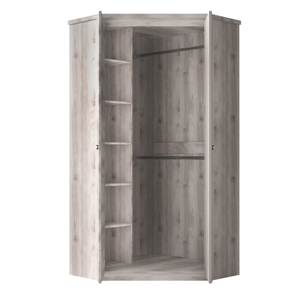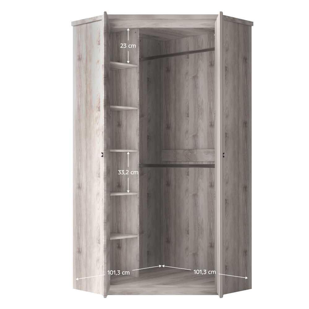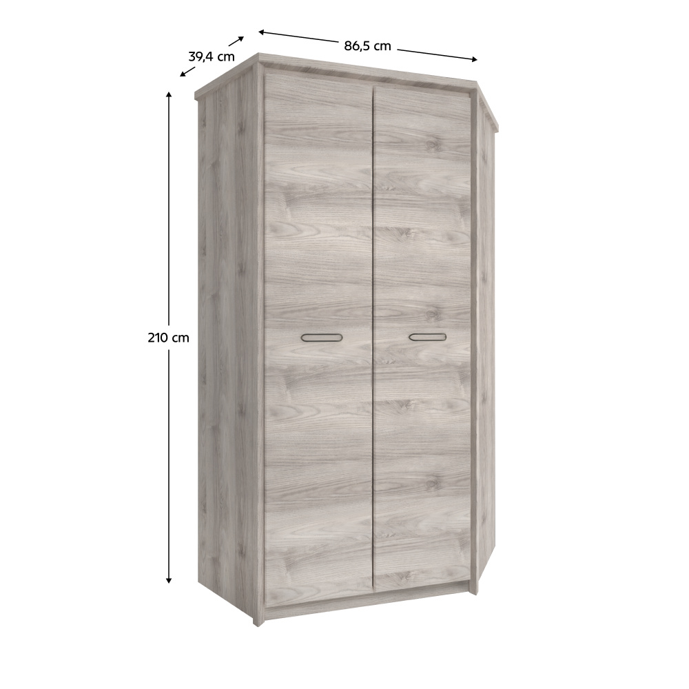 Materiál: DTD laminovaná Barva: kaštan nairobi Rozměry (ŠxHxV): 86,5x39,4x210 cm Tloušťka materiálu: 1,6-3,2 cm Kovové úchytky Barva úchytek: černá Plastové nožičky Úložný prostor Dvoudveřová Policová část Nosnost police: 5 kg Věšáková tyč Nosnost věšákové tyče: 15 kg Rohová Moderní design Dodáváno v demontu