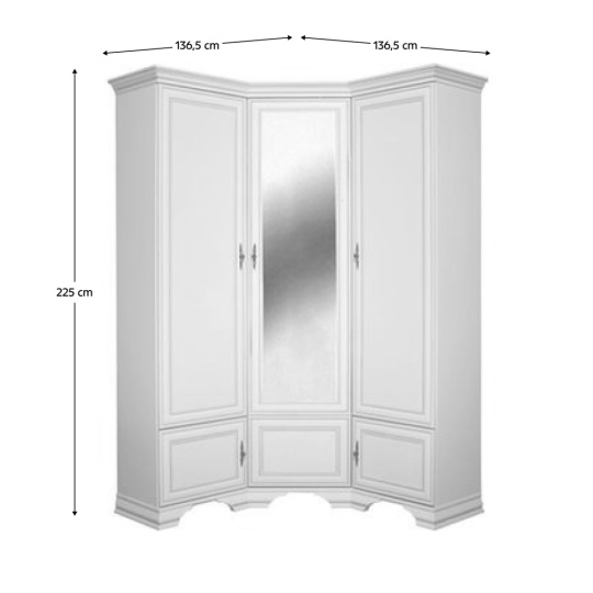 Materiál: DTD laminovaná Barva: alpská bílá Rozměry (ŠxHxV): 136,5x136,5x225 cm Tloušťka materiálu: 1,6 cm Třídveřová Na nožičkách Výška nožiček: 8 cm Kovové úchytky Barva úchytek: antické stříbro Úložný prostor Policová část Nosnost police: 4 kg Výsuvný věšák Se zrcadlem Doporučujeme připevnit ke zdi Dodáváno v demontu