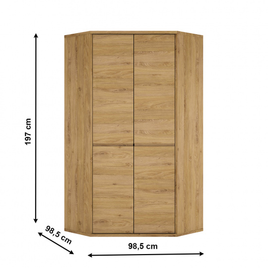 Materiál: laminovaná DTD Barevné provedení: dub Shetland/šedá Rozměry (ŠxHxV): 98,5x98,5x197 cm Tloušťka korpusu: 2,8 cm bez úchytová Jednoduchá a elegantní rohová hrubý korpus 7 poliček 1vešiaková tyč zavřená moderní styl vysoká kvalita precizní zpracování Odolný vůči poškrábání, UV záření, vysokým teplotám S nožičkami Nosnost poličky: 5 kg Nosnost šuplíku: 5 kg Dodávané v demontu