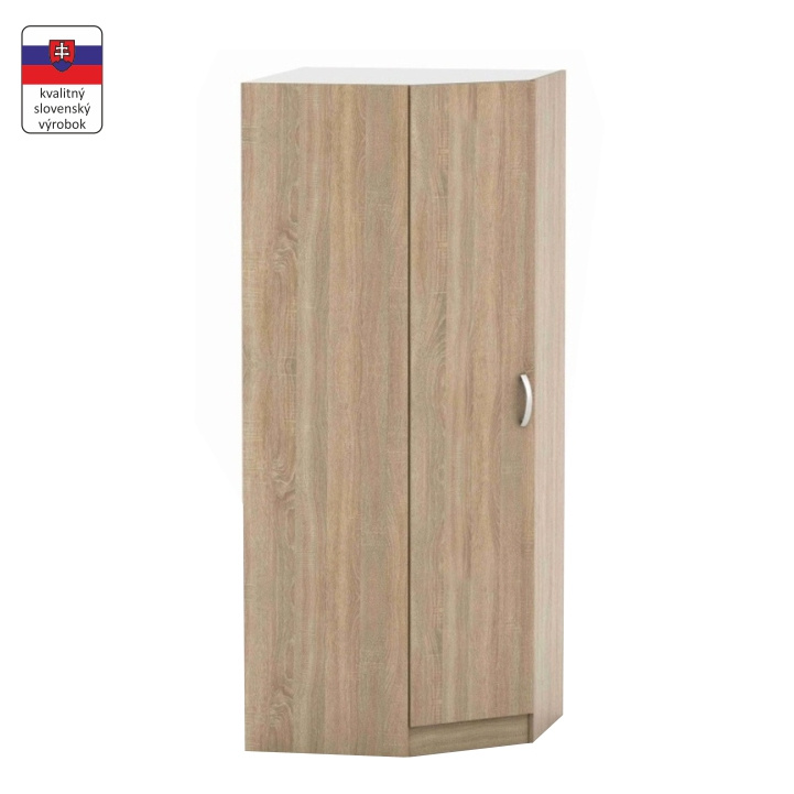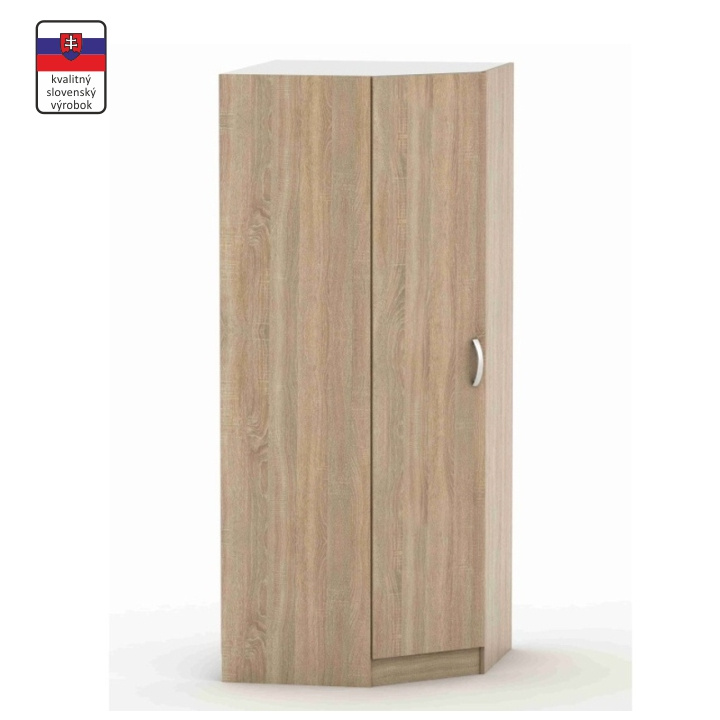 Rohová skříň DUNAJ TYP 15 Materiál: DTD laminovaná Provedení: dub sonoma Rozměry (ŠxHxV): 79x79x190,8 cm Tloušťka materiálu: 16 mm kovové úchytky Kvalitní slovenský výrobek Dodávané v demontu. Hmotnost: 85kg