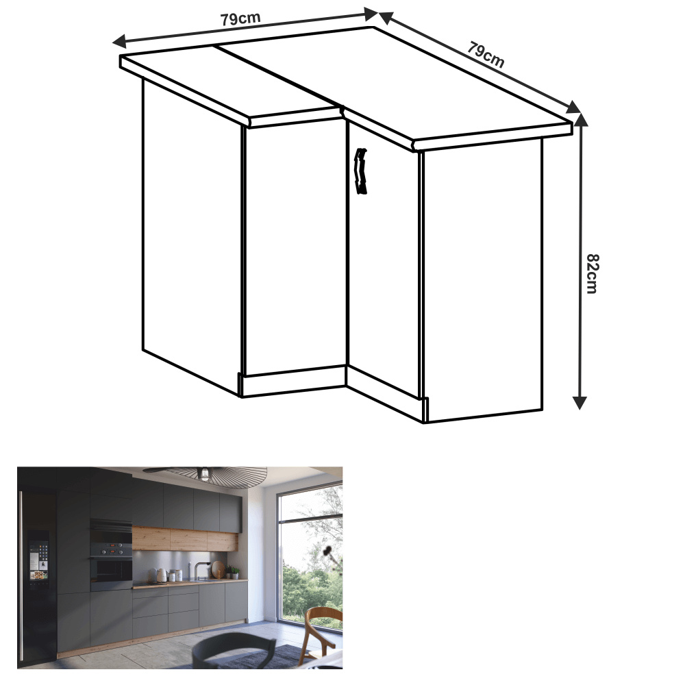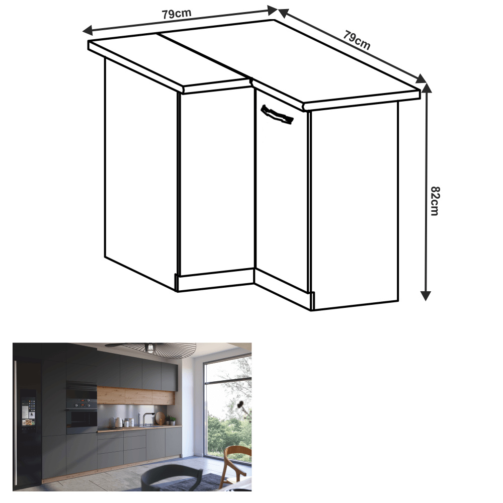 Materiál: DTD laminovaná Barva: dub artisan / šedý mat Rozměry (ŠxHxV): 79x79x82 cm Tloušťka materiálu dvířka (dub artisan): 1,5 cm Tloušťka materiálu dvířka (šedá MDF): 1,8 cm Bez pracovní desky Bez spodní lišty Barva vnitřní strany: bílá S policí Dodávané v demontu Cena sektorových skříněk je uváděna bez pracovní desky a spodní lišty. Cena za pracovní desku dub artisan je 1.890 Kč / bm - tloušťka 38 mm, cena za pracovní desku černý vulkán je 2.290 Kč / bm - tloušťka 38 mm. Možnost dokoupení spodní lišty dub artisan v rozměru 1 m za cenu 280 Kč nebo v rozměru 2 m za cenu 560 Kč a ukončení na sokl o hloubce 47 cm nebo 58 cm za 140 Kč. Ke každé dolní skříňce je nutné doobjednat 2 ks úchytů na sokl cena 40 Kč / 2 ks. U skříněk D60S3 a D40S3 je třeba si vybrat skříňku s úchytkou nebo systémem Push Open.