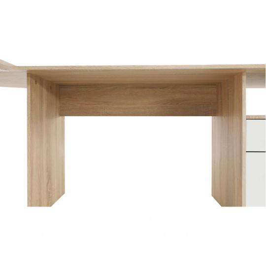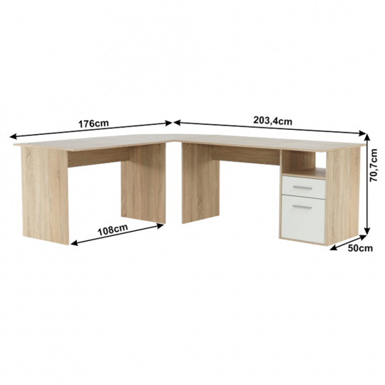 Materiál: laminovaná DTD Barva: dub sonoma / bílá Rozměry (ŠxHxV): 203,4x175,9 x70,3 cm Tloušťka materiálu: 16 mm Šířka stolu s kontejnerem: 135,9 cm Šířka stolu bez kontejneru: 108,5 cm Šířka stolu po kontejner: 93,4 cm Hloubka stolu: 67,4 cm Šířka kontejneru: 40,3 cm Výška šuplíku: 13,8 cm Výška skříňky: 32 cm Výška spojovací desky (čela): 18,6 cm šuplík skříňka Kvalitní slovenský výrobek Dodávané v demontu