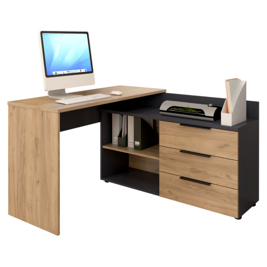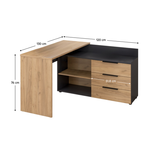 Materiál: DTD laminovaná Barva: grafit/dub artisan Rozměry (ŠxHxV): 120x130x76 cm Rozměr vrchního platu stolu (ŠxV): 120x50 cm Tloušťka materiálu: 1,6-2,2 cm Otevřený úložný prostor Tři šuplíky Rozměr šuplíku (ŠxV): 51,8x33,3 cm Nosnost šuplíku: 5 kg Policový Nosnost police: 5 kg Nosnost vrchního platu stolu: 35 kg Rohový Univerzální S úchytkou Barva úchytky: grafit Na nožičkách Výškově nastavitelné nožičky Materiál nožiček: kov Barva nožiček: černá Výška nožiček: 2,8-4,3 cm Hmotnost: 57 kg Kvalitní slovenský výrobek Dodáváno v demontu