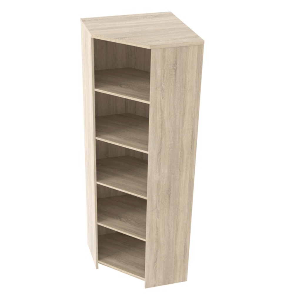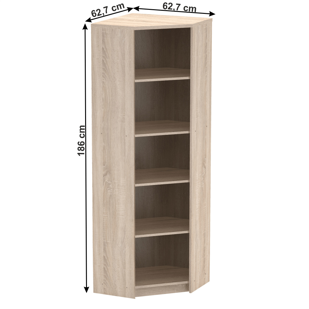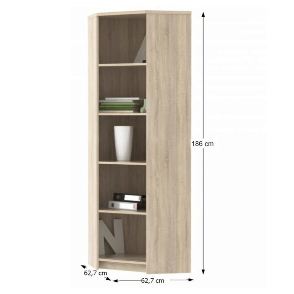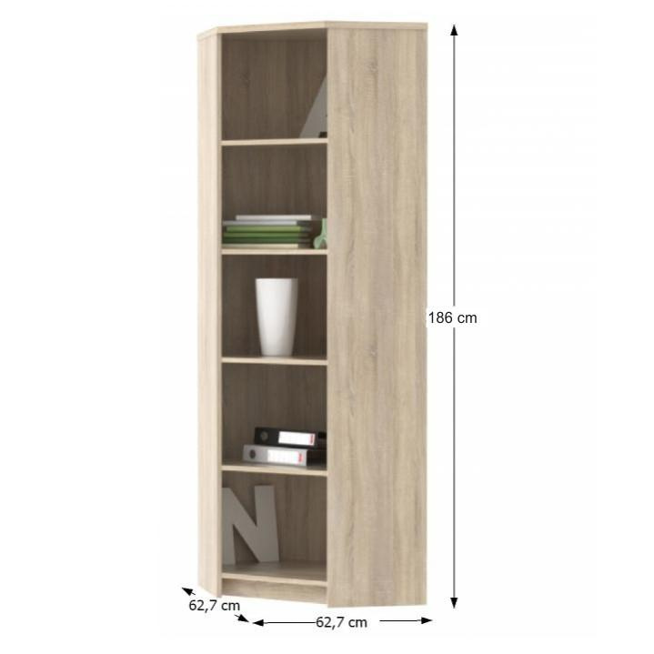 Rohový kancelářský regál JOHAN 2 NEW 09 se čtyřmi policemi barevné provedení: dub sonoma materiál: DTD lamiovaná Rozměry (ŠxHxV): 62,7x62,7x186 cm Tloušťka materiálu: 16/22 mm slovenský výrobek ABS hrany Dodávané v demontu