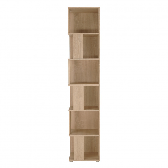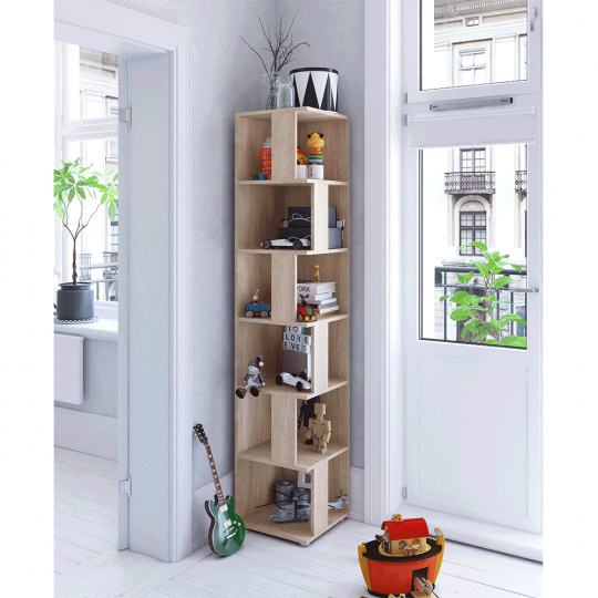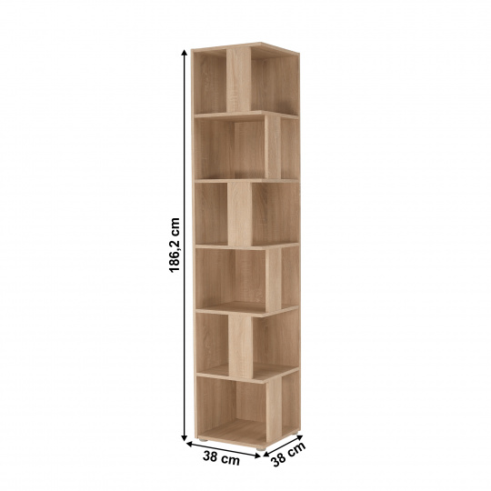 víceúčelový rohový regál Korind Materiál: DTD laminovaná Barva: dub sonoma Rozměry (ŠxHxV): 38x38x186,2 cm Hmotnost: 29 kg Kvalitní slovenský výrobek 6 polic Nejlepší umístění do kouta místnosti Do obývacího pokoje, dětského pokoje, ložnice, předsíni, pracovny apod. Dodávané v demontu