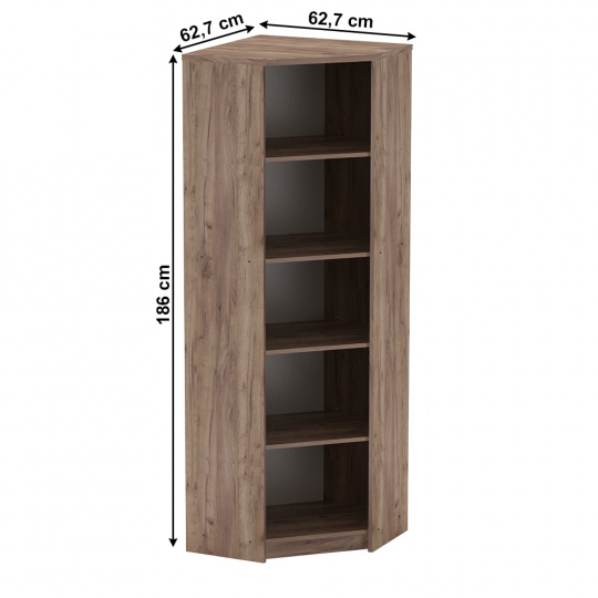 Rohový kancelářský regál JOHAN 2 NEW 09 se čtyřmi policemi Barevné provedení: kraft dunkel/bíla Materiál: DTD lamiovaná Rozměry (ŠxHxV): 62,7x62,7x186 cm Tloušťka materiálu: 16/22 mm slovenský výrobek ABS hrany Dodávané v demontu