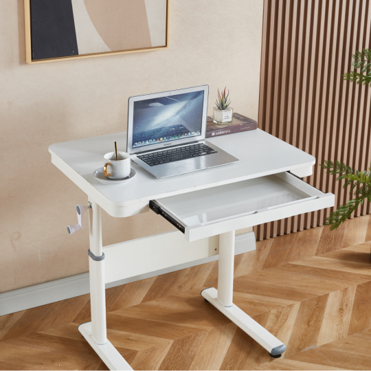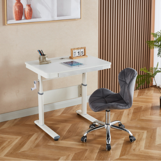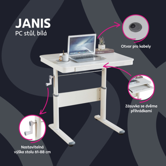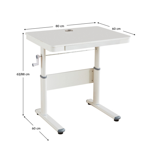 Materiál: MDF/PVC fólie/kov Barva: bílá Rozměry stolu (ŠxHxV): 80x60x63-88 cm Tloušťka materiálu MDF s PVC fólií: 1,5 cm Nosnost: 30 kg Hmotnost: 15,3 kg Vhodné od 3 do 18 let Nastavitelná výška stolu Manuální nastavení výšky stolu pomocí kliky Jeden šuplík Vnitřní rozměry šuplíku (ŠxHxV): 50x30x3,5 cm Dvě malé přihrádky na pera Kovové kolejničky Otvor pro provedení kabelů Dodáváno v demontu