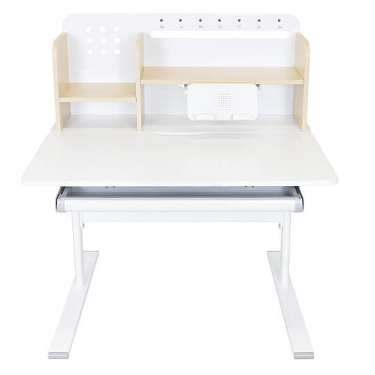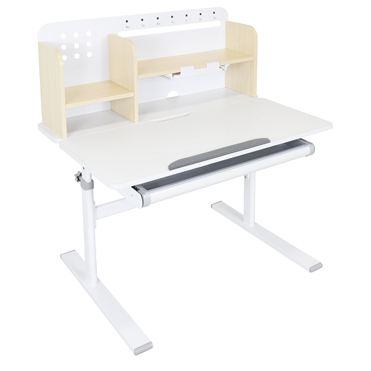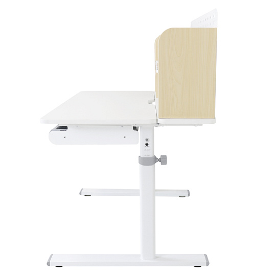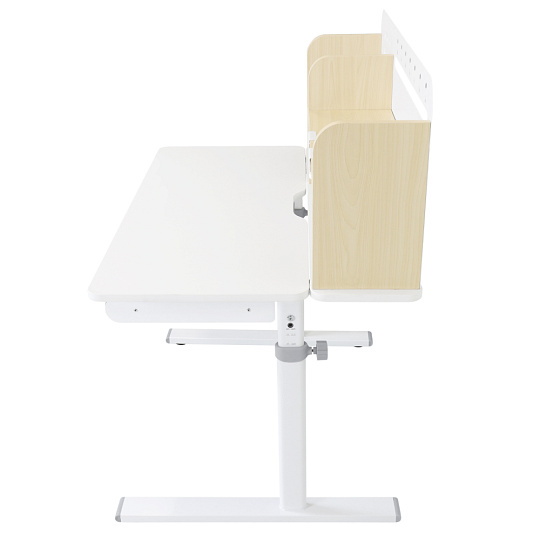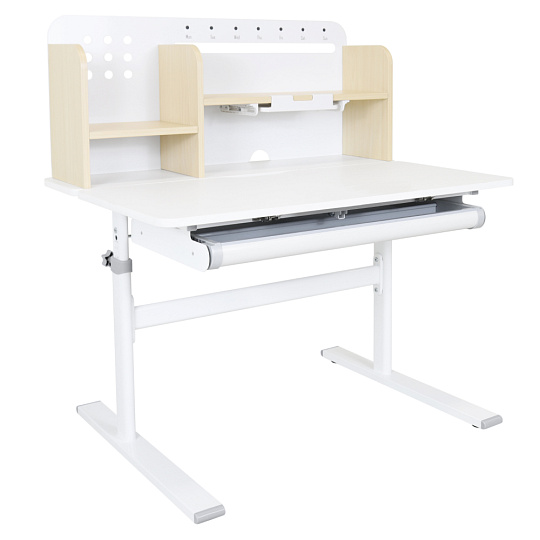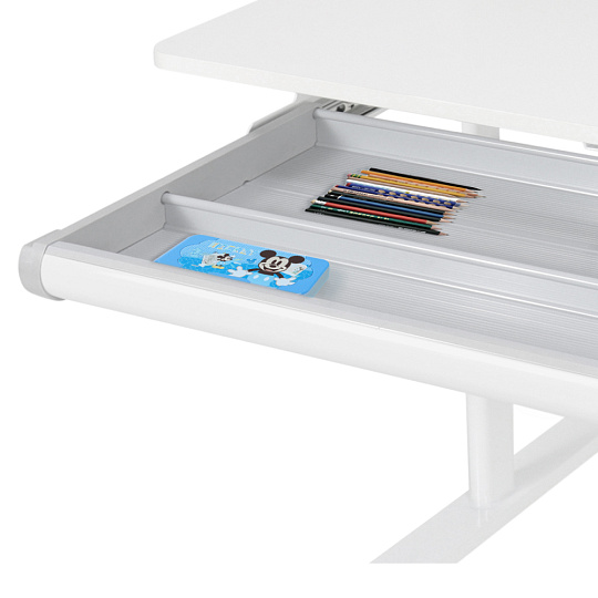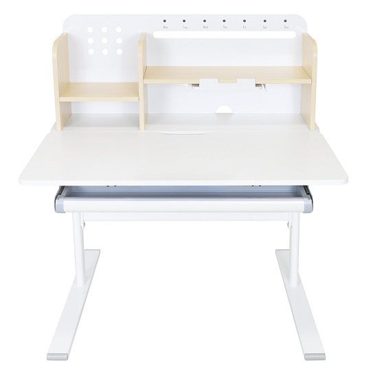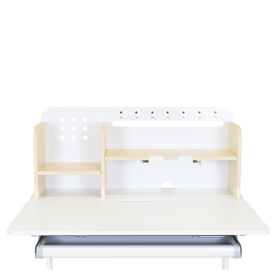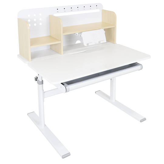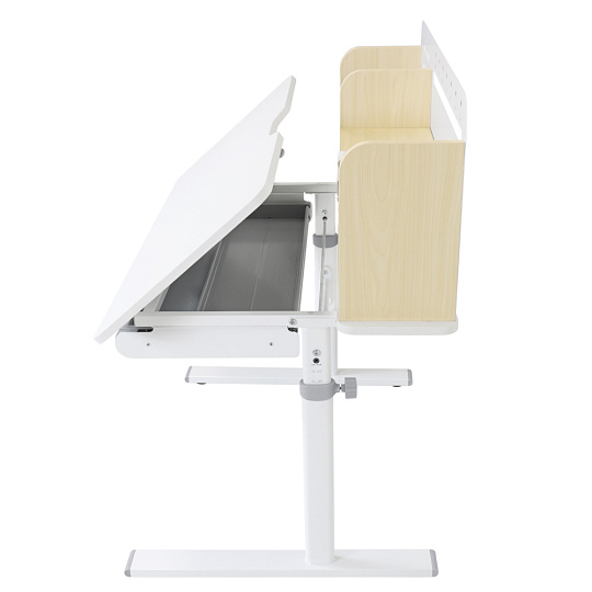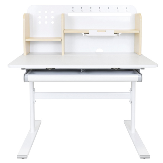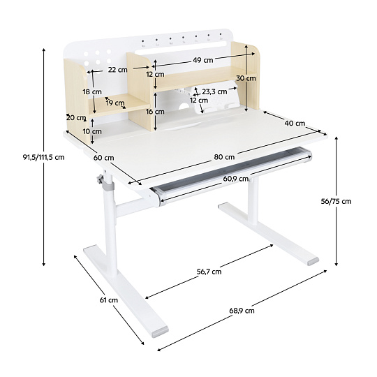 Materiál: laminovaná MDF/plast/kov Barva: přírodní/bílá Deska stolu je s PVC hranami Rozměry stolu (ŠxHxV): 80x60x91,5-111,5 cm Šířka podstavy: 68,9 cm Hloubka podstavy: 61 cm Výška pracovní plochy: 56-75 cm Hloubka polohovací části pracovní desky: 40 cm Šířka a výška zadního panelu: 75,6x36,5 cm Šířka menší police: 22 cm Šířka větší police: 49 cm Šířka zásuvky: 60,9 cm Tloušťka materiálu MDF: 1,5 cm Sklon pracovní desky: 0-40° Nastavitelný sklon pracovní desky Nastavitelná výška stolu Plynulé nastavení výšky stolu a úhlu pracovní plochy Manuální nastavení výšky stolu pomocí kliky Kliku lze umístit z pravé nebo z levé strany Nastavení úhlu pracovní plochy pomocí plynového pístu a páčky Prostorná zásuvka s přihrádkou Police na knihy Držák na knihy Lišta s označením dní V zadní části police se nachází otvor pro vedení kabelů Vhodné od 3 do 12 let Pro děti o výšce 100 - 150 cm Dodáváno v demontu